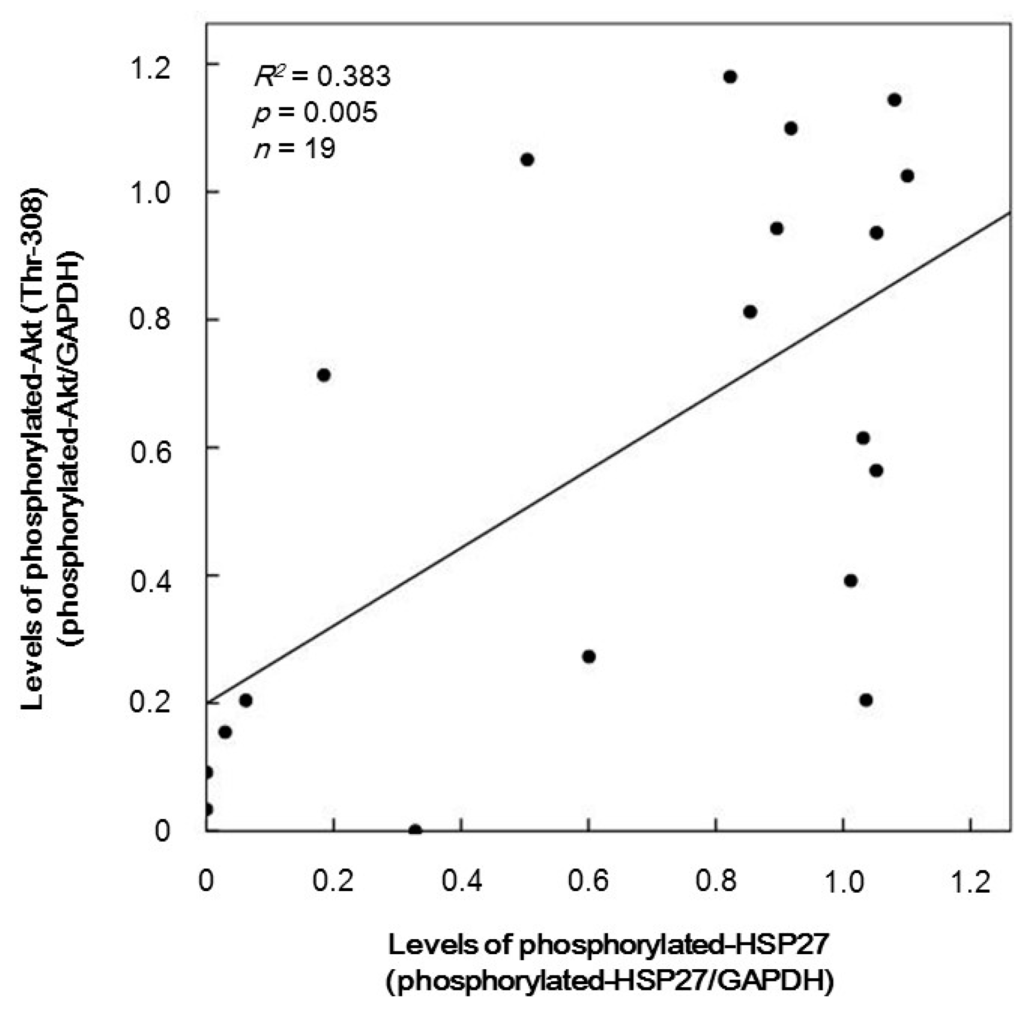 In order to investigate the relationship between HSP27 phosphorylation and Akt activation in the TRAP-stimulated platelets, we plotted the individual levels of phosphorylated-HSP27 against those of phosphorylated-Akt induced by 10 µM TRAP in the group of Western blotting. The levels of phosphorylated-Akt (Thr-308) were significantly correlated with those of the HSP27 phosphorylation (Ser-78) (R2 = 0.383, p = 0.005) (Figure 2).
