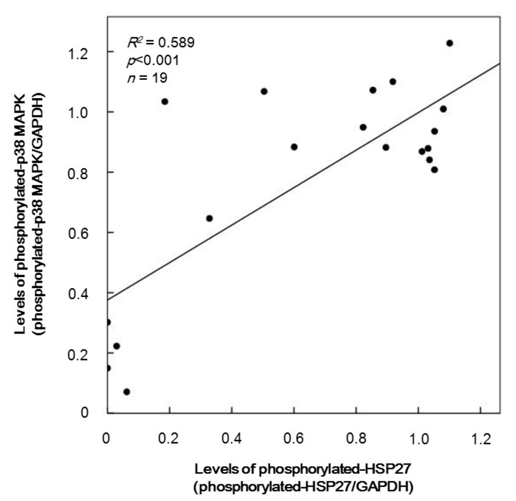 It is generally recognized that HSP27 is phosphorylated via p38 MAP kinase activation []. We next plotted the individual levels of phosphorylated-HSP27 against those of phosphorylated-p38 MAP kinase induced by 10 µM TRAP in the group of Western blotting. The phosphorylated levels of p38 MAP kinase were directly proportional to the phosphorylated-HSP27 levels (Ser-78) (R2 = 0.589, p < 0.001) (Figure 3).