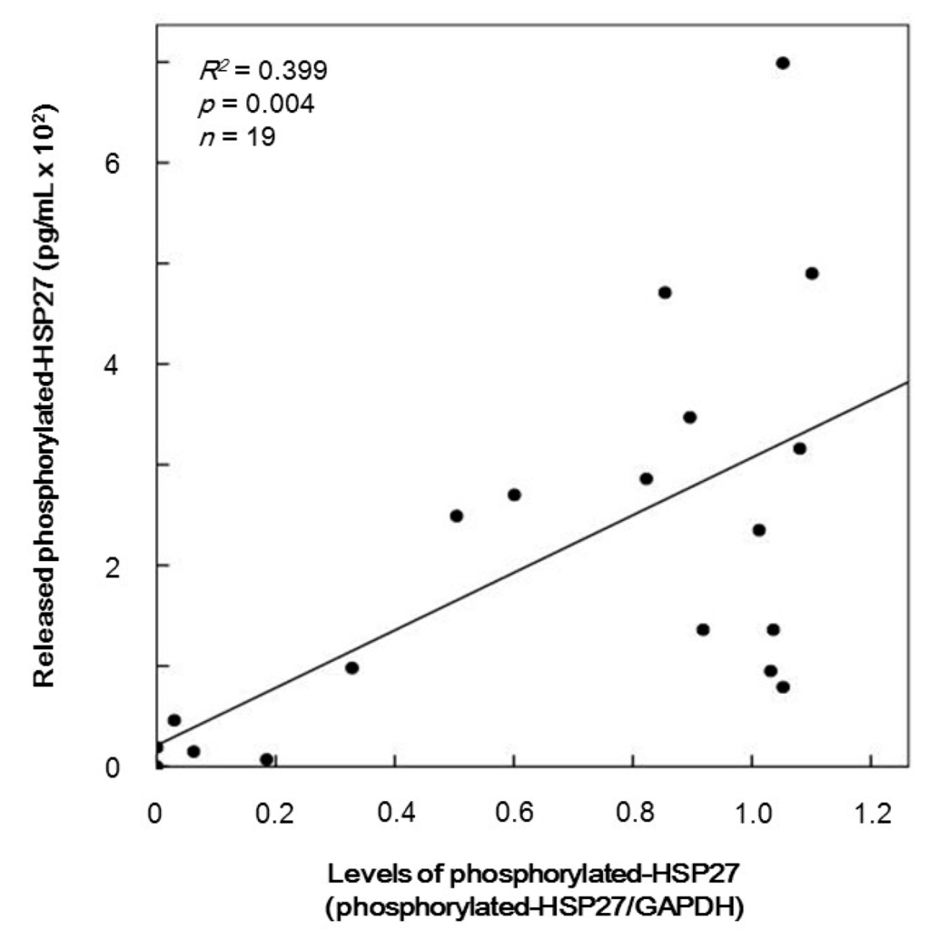 We next investigated whether the phosphorylated-HSP27 induced by TRAP is released from the platelets of type 2 DM patients. We measured the release of phosphorylated-HSP27 under the stimulation of 10 µM TRAP and analyzed the relationship between the individual levels of extracellular phosphorylated-HSP27 and intracellular TRAP-induced phosphorylation of HSP27 in the platelets. The levels of released phosphorylated-HSP27 stimulated by TRAP were directly proportional to the levels of intracellular phosphorylated-HSP27. Therefore, our findings suggest that the TRAP-induced phosphorylation of HSP27 elicits the release of HSP27 from the TRAP-activated platelets into circulation.