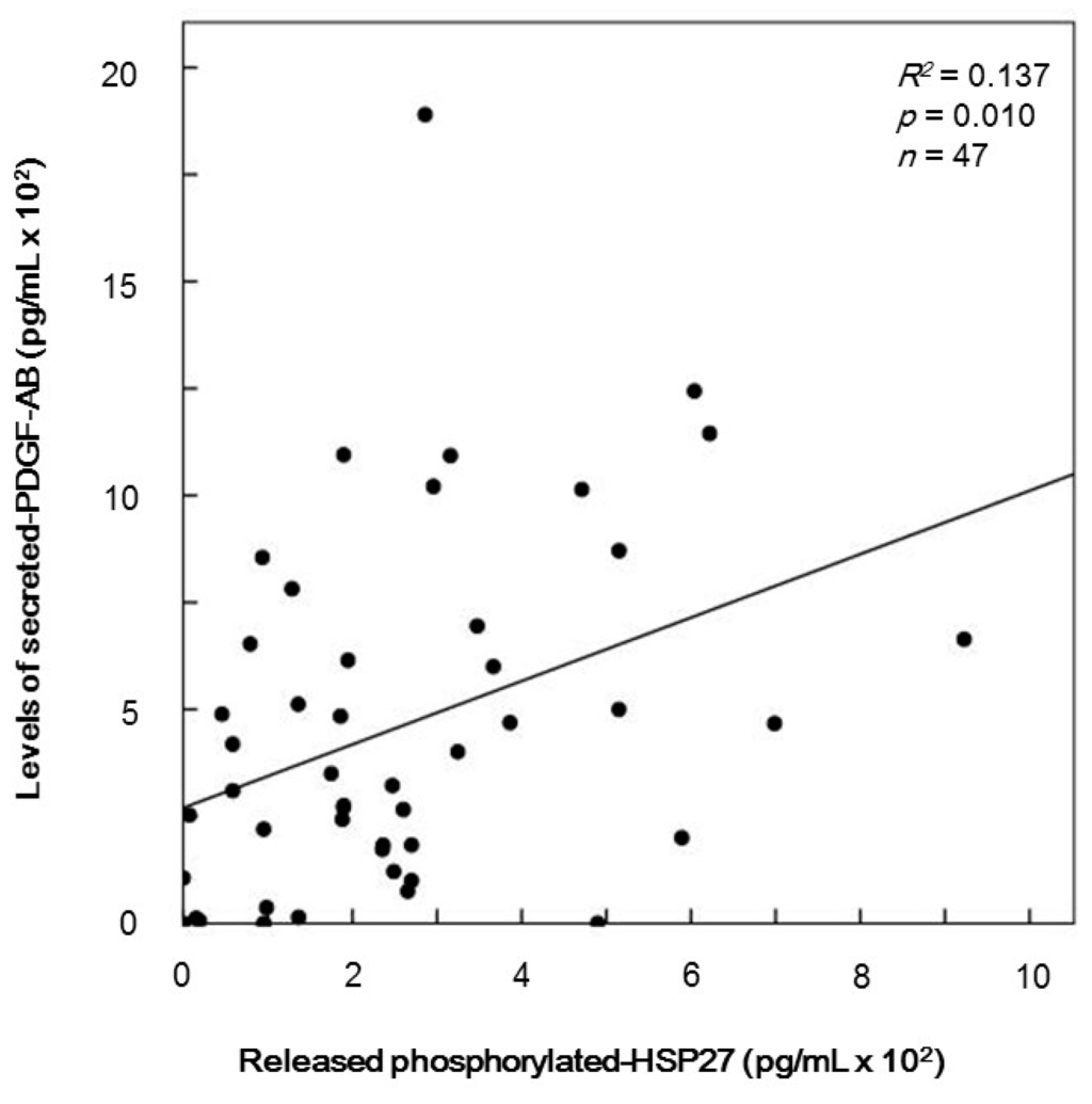 The relationship between individual levels of released phosphorylated-HSP27 and the levels of secreted platelet-derived growth factor-AB (PDGF-AB) in the supernatant of the conditioned plasma after platelet aggregation stimulated by 10 µM of TRAP for 4 min were determined using specific ELISA kits. The baseline levels without stimulation were subtracted from each of the individual levels of the release of phosphorylated-HSP27 and PDGF-AB. These data were plotted and then analyzed by linear regression analysis.