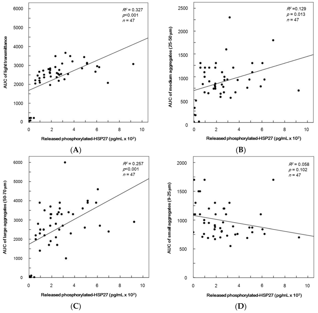 To clarify whether TRAP-induced aggregation of platelet is related to the release of phosphorylated-HSP27 from the activated platelets, we plotted the levels of individual area under the curve (AUC) of platelet aggregation including transmittance and the size of aggregates against the levels of released phosphorylated-HSP27 induced by 10 µM TRAP in the platelets of type 2 DM patients. The levels of released phosphorylated-HSP27 were significant to AUC of light transmittance (Figure 6A). In addition, AUC of medium aggregates (25–50 µm) and large aggregates (50–70 µm) were directly proportional to the levels of released phosphorylated-HSP27 (R2 = 0.129, p = 0.013; R2 = 0.257, p < 0.001; R2 = 0.327, p < 0.001, respectively, n = 47) (Figure 6B,C). However, there was no significant relationship between AUC of small aggregates (9–25 µm) and the levels of extracellular phosphorylated-HSP27 (R2 = 0.058, p = 0.102, n = 47) (Figure 6D).