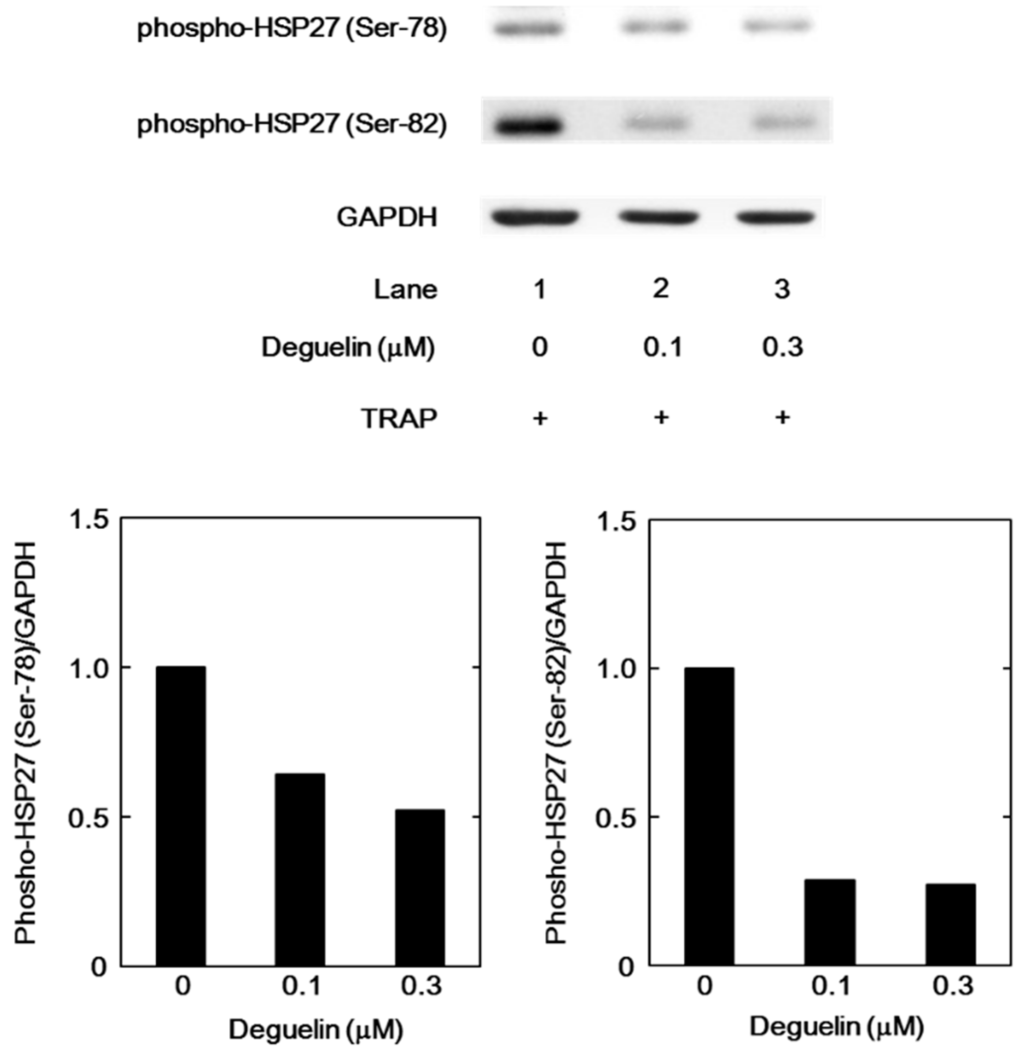 The effect of degueline on the TRAP-induced phosphorylation of HSP27 in the platelets from a healthy subject. PRP from a healthy subject was pretreated with various doses of deguelin for 15 min and then stimulated by 20 µM of TRAP at 37 °C for 4 min. The reaction was terminated by the addition of an ice-cold EDTA (10 mM) solution. The lysates of platelets were subjected to a Western blot analysis making use of antibodies against phospho-specific HSP27 (Ser-78 and Ser-82) and GAPDH. The bands were quantified by ImageJ as the counts of pixels. The bands of phospho-HSP27 were normalized to the GAPDH bands. The ratio is presented for each value. The upper panel indicates the bands of Western blot, and lower panels indicate each ratio.