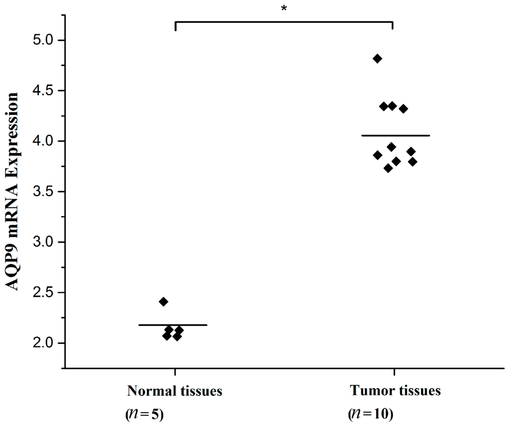 We first evaluated the expression level of AQP9 in two prostate cancer cells PC-3, LNCap by immunofluorescence, and Western blot. AQP9 immunoreactivity was identified mainly in the cytoplasm of cells (Figure 1A). Moreover, in Western blot analysis we treat normal liver tissue as positive control which was reported before [11], and results revealed that two cell lines, PC-3 and LNCap, showed AQP9 protein expression (Figure 1B). We then analyzed data of prostate cancer patients from GEO (Gene Expression Omnibus) dataset (Access ID: GSE55945) and found that AQP9 expression significantly increased in prostate cancer tissues compared with the adjacent tissues of patients (Figure 2).