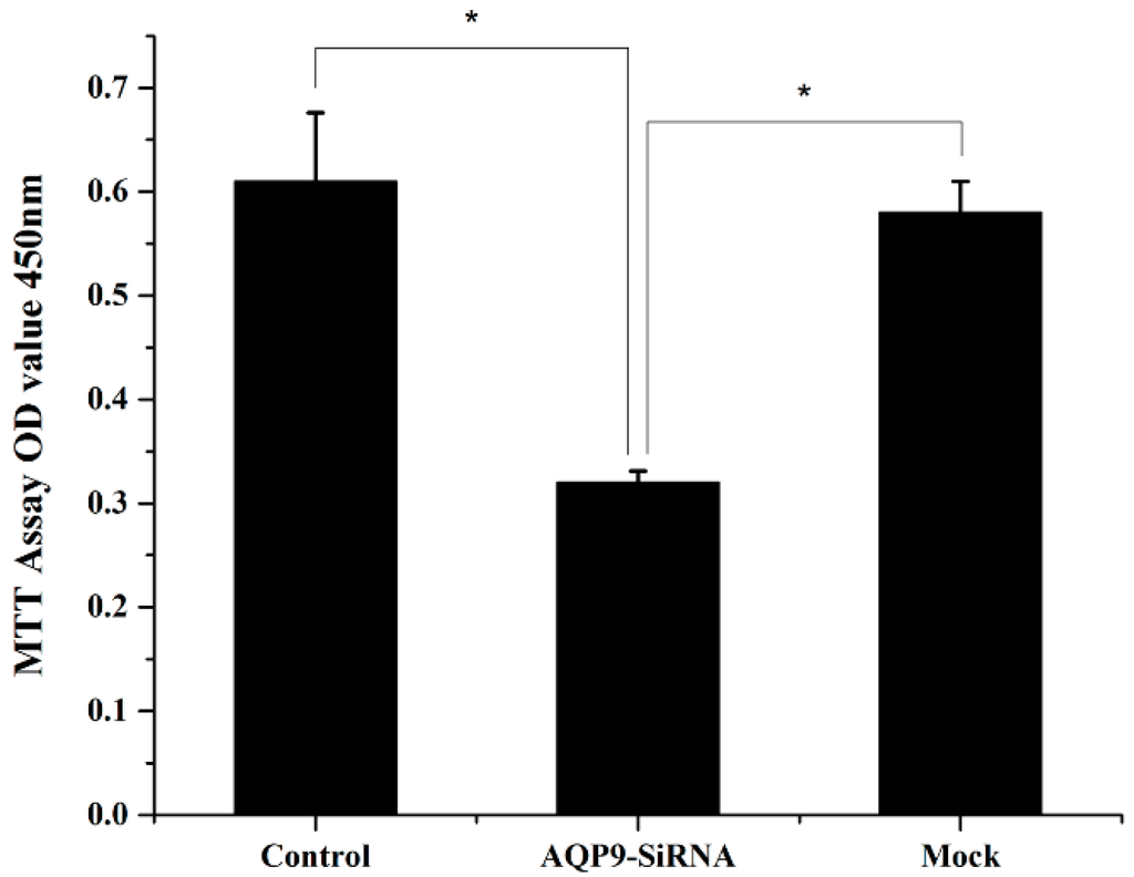Cell proliferation was detected 24 h after specific small interfering RNA in cells (p < 0.05 as compared with control). Control: wild-type cells; AQP9-siRNA: cells transfected with AQP9 specific small interfering RNA; Mock: cells only treated with Lipofectamine 2000. Data were based on three independent experiments, and shown as mean ± SD, * p < 0.05.