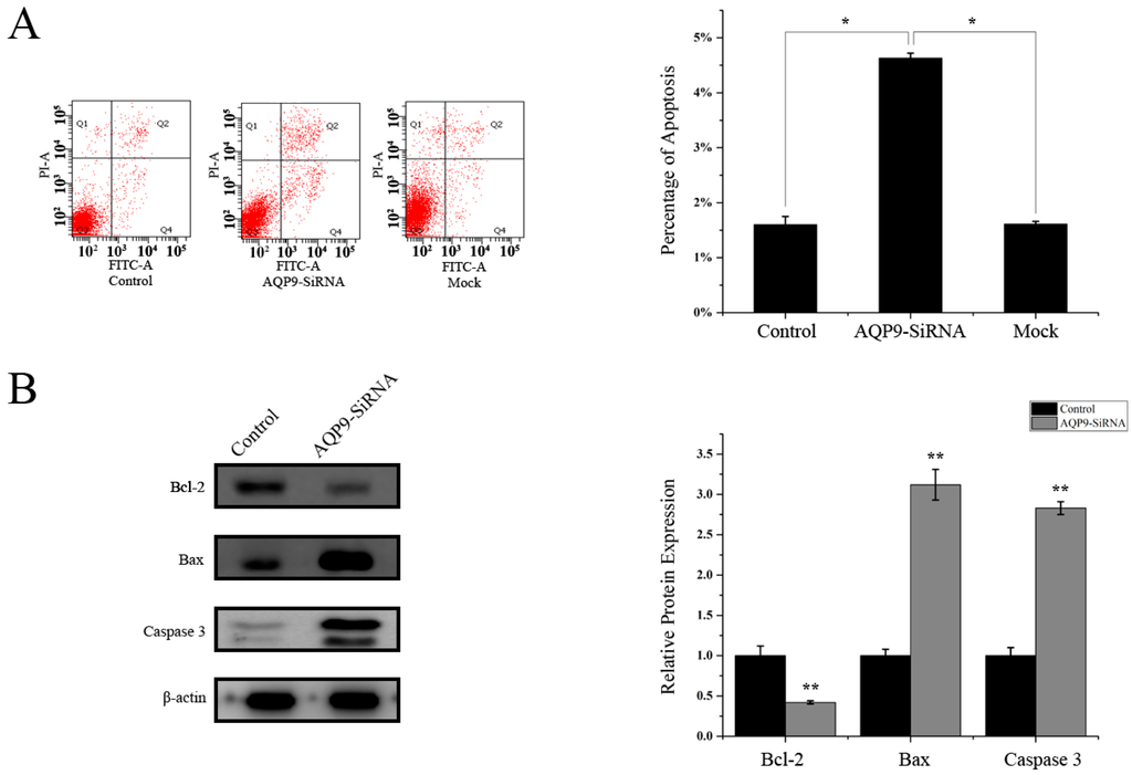 (A) Cells were double-stained with Annexin V-FITC/PI and apoptosis rates was analyzed using flow cytometry (p < 0.05 as compared with control); (B) protein levels of cleaved caspase 3, Bax, and Bcl2 were detected by Western blot. Data were shown as mean ± SD (p < 0.05 as compared with control). The mean of targeted protein/β-actin expression in PC-3 cells set as 1.0.Control: wild-type cells; AQP9-siRNA: cells transfected with AQP9 specific small interfering RNA; Mock: cells only treated with Lipofectamine 2000. * p < 0.05; ** p < 0.01.