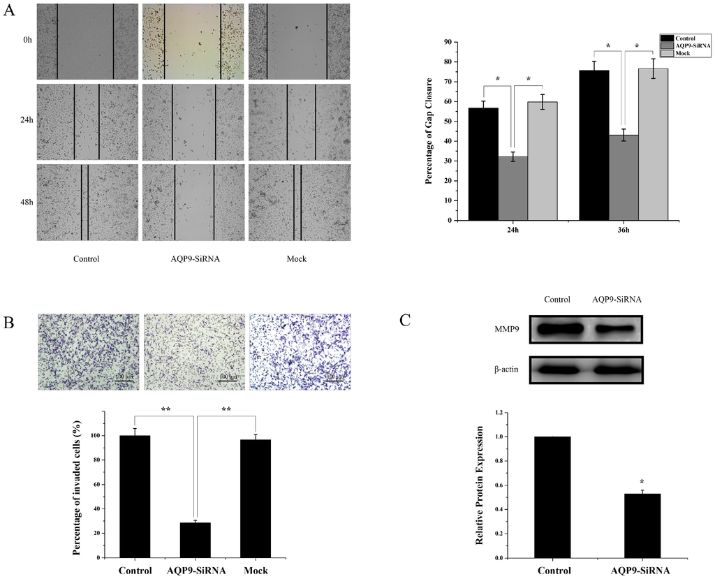 A wound healing assay and matrigel invasion were then conducted with control cells, AQP9 siRNA-transfected cells, and mock cells. The results showed that silencing of AQP9 inhibited the motility of PC-3 cells (Figure 6A). The effect of AQP9 on invasion of prostate cancer cell was further investigated. The results demonstrated that AQP9 siRNA-transfected cells had lower invasion capabilities compared with the control cells (Figure 6B). MMP (matrix metalloprotein) family play an important role in invasion and metastasis of cancer cells; therefore, the expression of MMP9 between control and AQP9-siRNA were conducted. Western blot analysis showed that silencing of AQP9 downregulated the expression of MMP9 (Figure 6C). These results suggested that AQP9 expression affects the motility and invasiveness of prostate cancer cells.