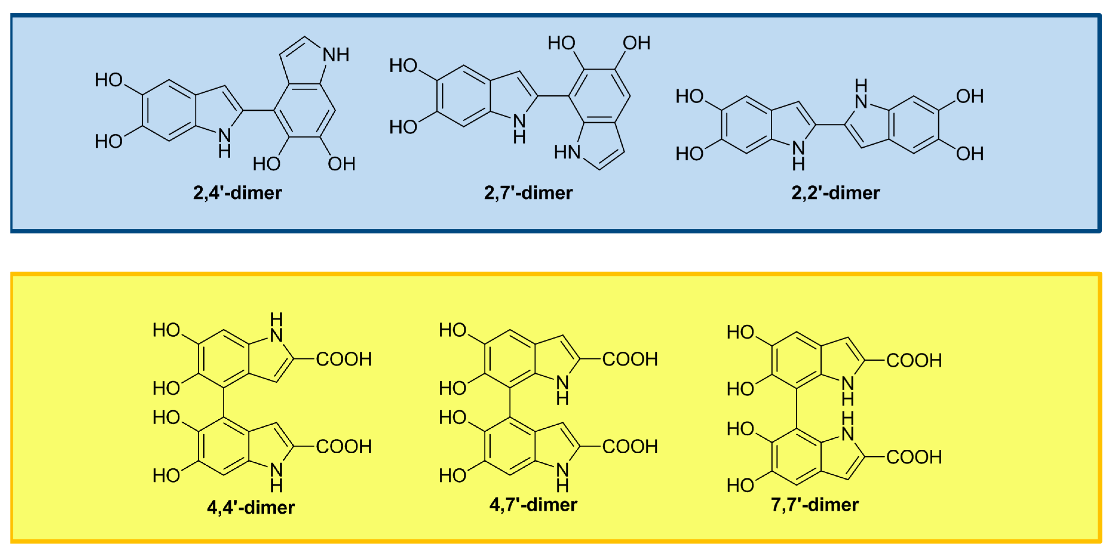 DHI oxidation gives rise to dimers, trimers and tetramers, primary coupled through 2,2’-, 2,4’- and 2,7’-bonding (Figure 1) [25,26,27,28,29].