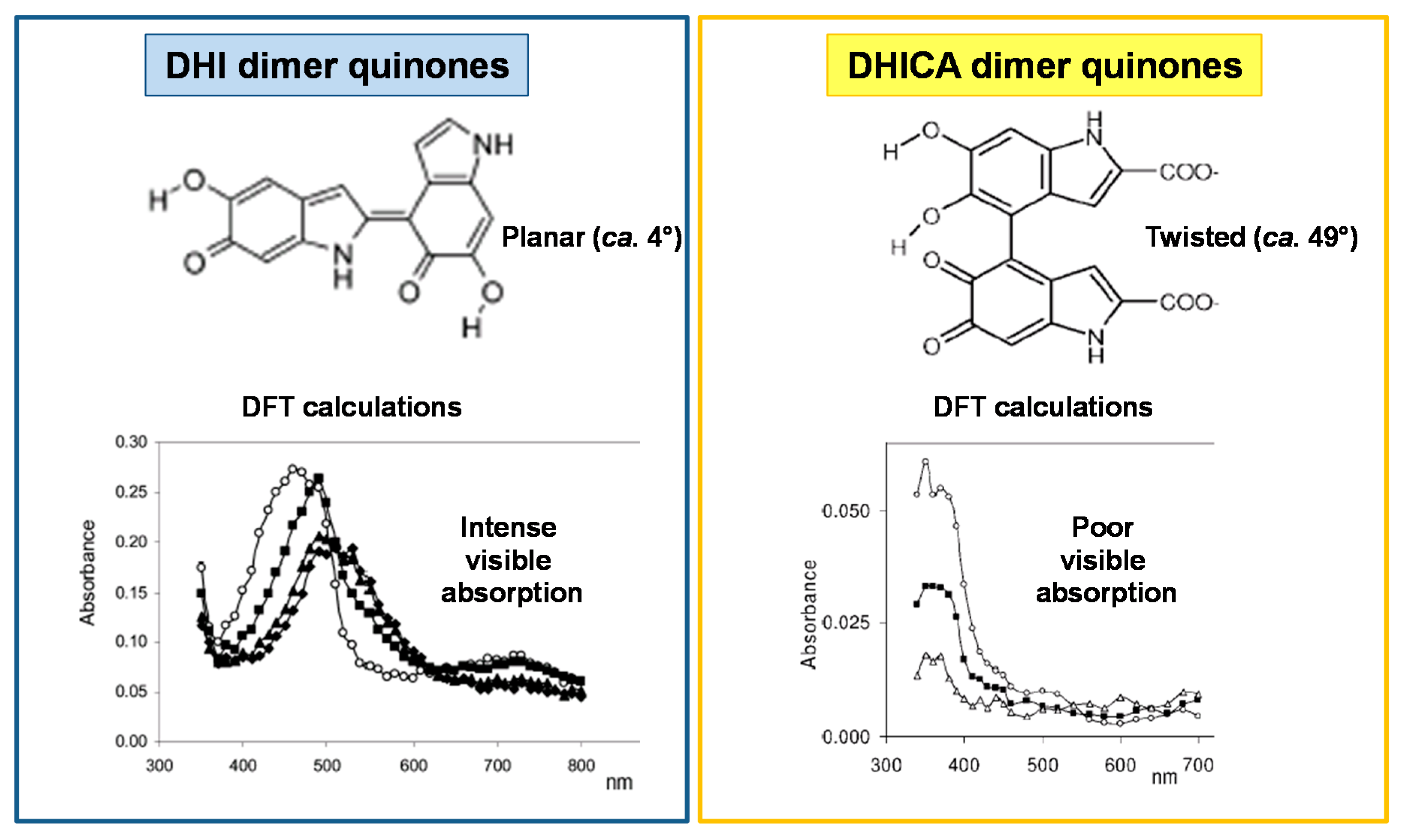 Oligomers of DHICA exhibit structural features different from those of DHI. While the latter oligomers can adopt planar conformations, DHICA polymerizes mainly through biphenyl-type bonds, resulting in the generation of non-planar, partly linear backbones exhibiting hindered rotation (atropisomerism) at the interunit bonds [31,32]. Deviation from coplanarity in DHICA oligomers is supported by the negative charge of the carboxylate groups forcing twisting about the inter-ring bond. The so-formed twisted backbones cannot give rise to π-stacked supramolecular aggregates, at variance with the largely planar oligomeric scaffolds derived from DHI. Therefore, while DHI dimers generate on oxidation largely planar species absorbing strongly in the visible range, DHICA oligomers do not produce significant visible absorption above 400 nm, due to inter-unit dihedral angles of ca. 49° with localized o-quinone moieties and significant interruption of inter-unit π-electron delocalization (Figure 2) [33,34].
