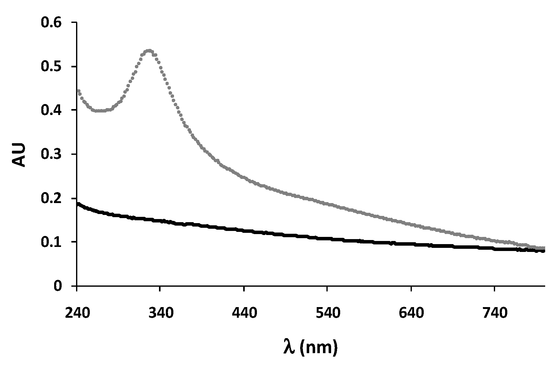 UV-visible spectra of DHI (black trace) and DHICA melanin (gray trace) at pH 7.5.