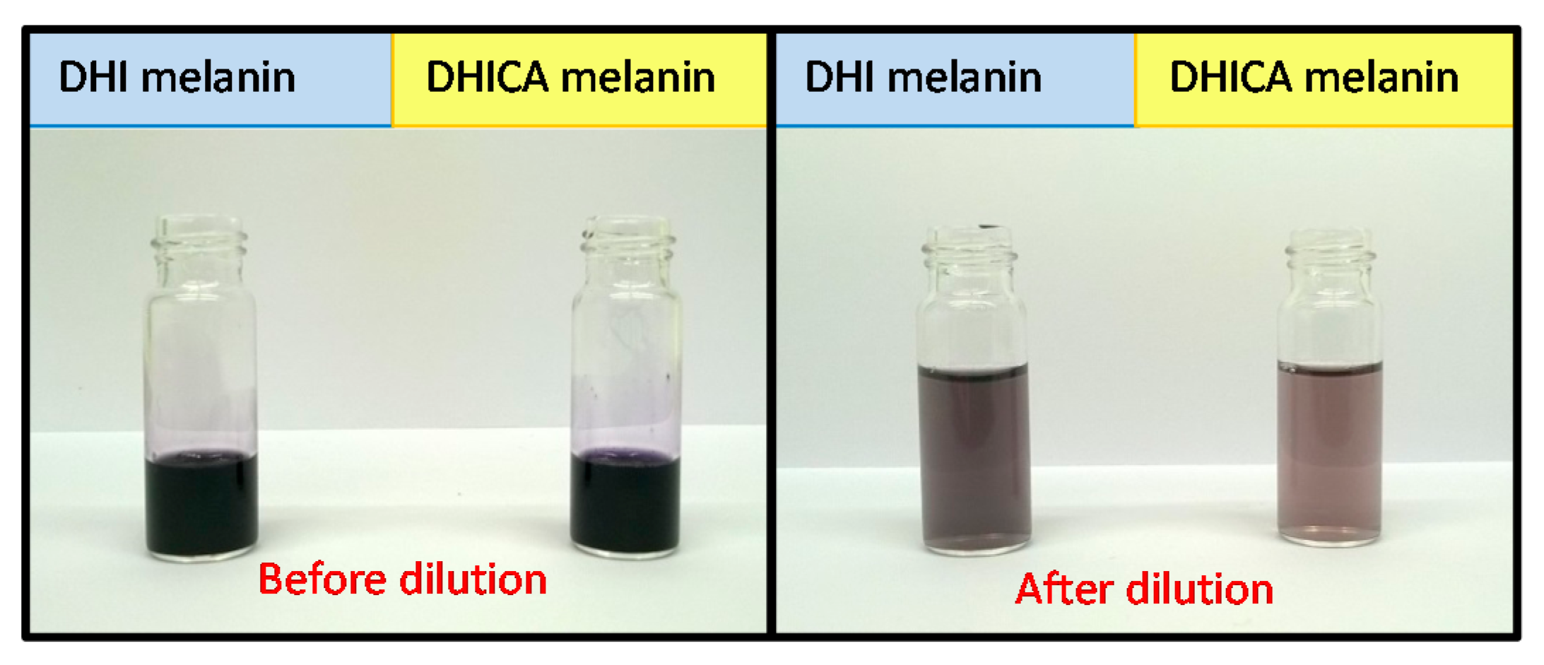 Recently, a comparison of the UV-visible spectra of soluble melanins from DHI and DHICA in the presence of polyvinyl alcohol (PVA) was carried out [38,39]. Despite apparent similarities, the absorption spectra of the two pigments differed in the presence of a pronounced broad band around 500 nm in the case of DHI-derived eumelanin, which was negligible for the DHICA polymer. Notably, upon dilution in PVA-containing buffer, DHICA-melanin gradually lost its visible absorption properties (the “black” color), whereas DHI-melanin did not (Figure 4).
