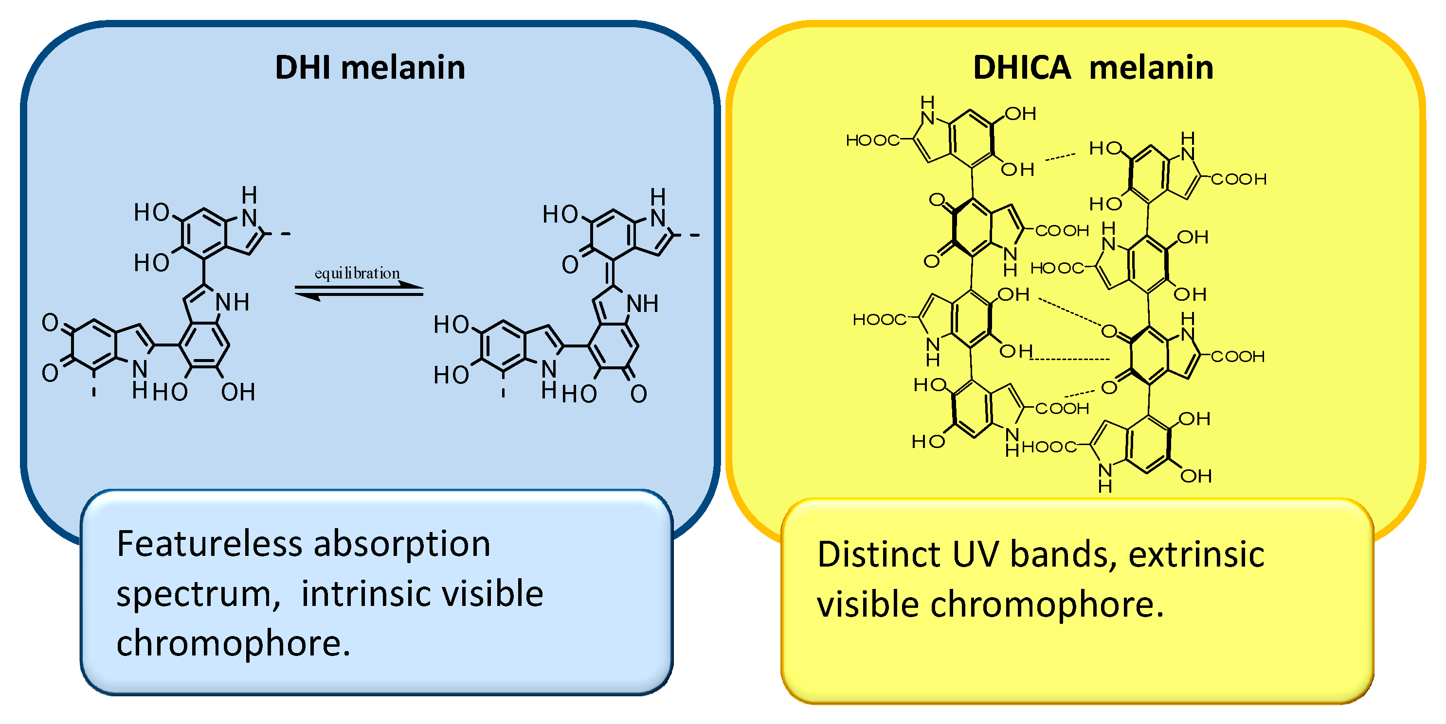 Consequently, it has been suggested that while the DHI-melanin chromophore is determined for the most part by intrinsic effects relating to efficient π-electron delocalization within the largely planar oligomeric scaffolds, the black chromophore of DHICA melanin derives largely from aggregation-dependent intermolecular perturbations of the π-electron systems, being therefore mainly extrinsic in character (Figure 5) [38].