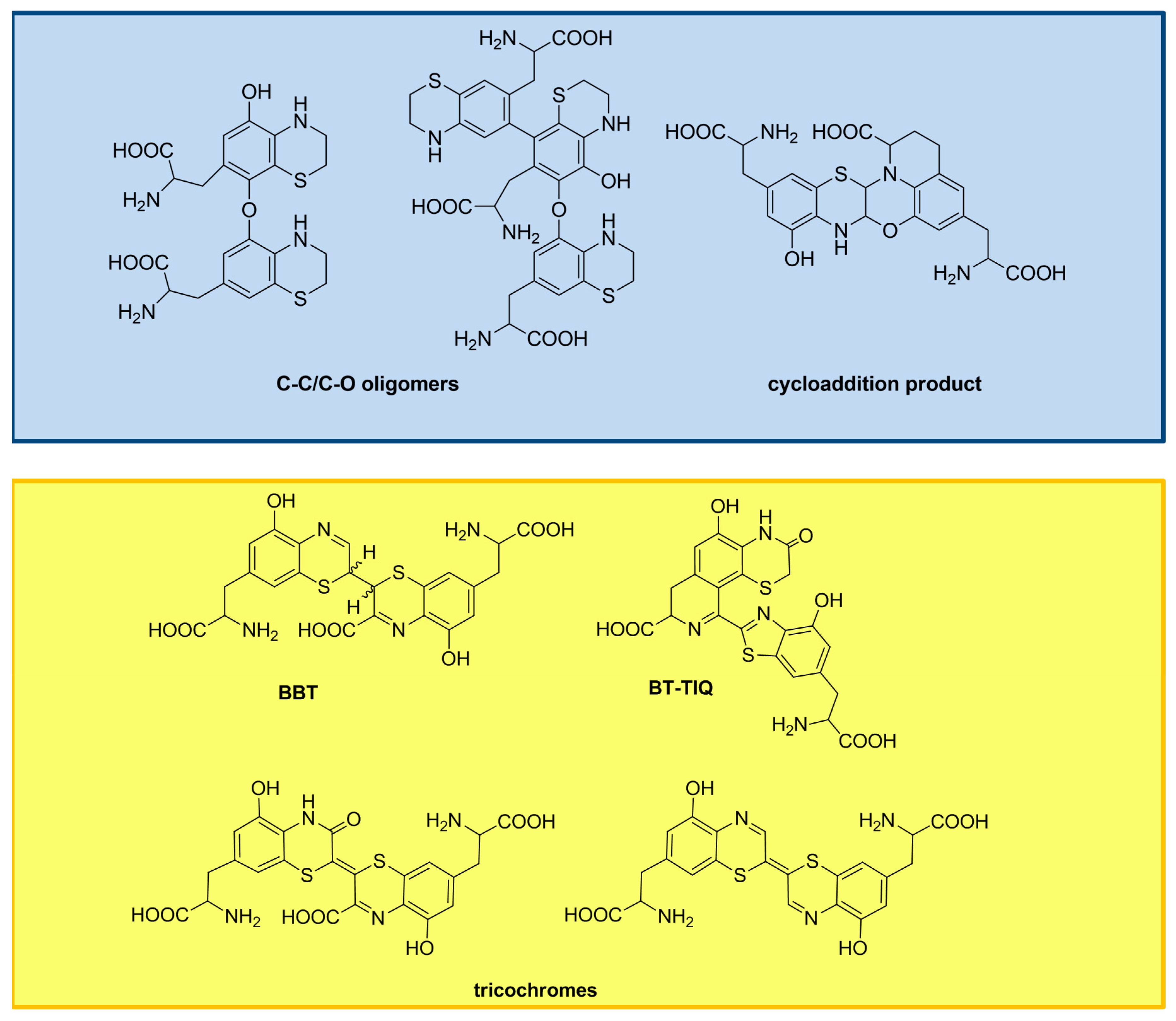 Pheomelanin pigments are formed by oxidative polymerization of BTZ and BTZCA, which may follow different paths depending on the presence of the carboxyl group on the 3-position. Oligomers characterized by C–C and C–O bonds were isolated from the peroxidase/H2O2 oxidation mixture of 5SCD via BTZ after reductive treatment (Figure 7) [44], whereas an unusual cycloaddition product was formed during the tyrosinase-catalyzed oxidation (Figure 7) [45]. In contrast, oxidation of BTZCA leads to the 2,2’-bibenzothiazines (BBT) [23]. Further oxidative steps would lead to the trichochromes [46]. A main dimeric product of BTZCA, featuring isoquinoline and benzothiazole moieties (BT-TIQ), has been characterized as the most important building block of natural pigments from red hair and chicken feathers (Figure 7) [47,48,49].