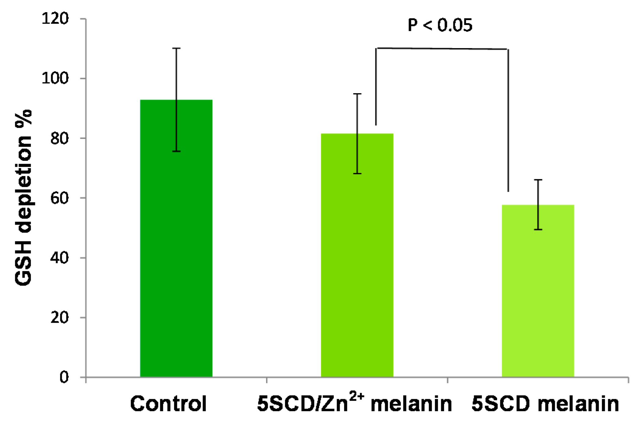 Glutathione (GSH) depletion (%) after 3 h in 0.1 M phosphate buffer (pH 7.4) in the absence or in the presence of 5SCD melanin prepared in the absence or in the presence of Zn2+ ions. Reported are the mean ± SD values from at least five experiments. Significant differences were determined by an independent sample two-tailed t-test.