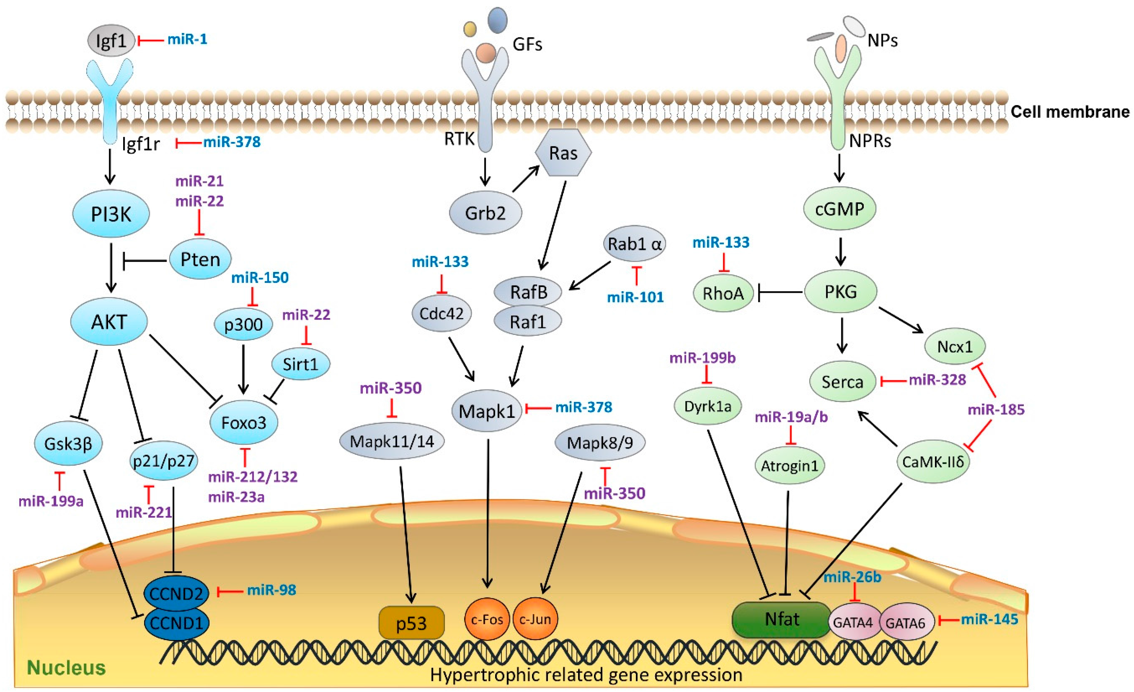 MicroRNAs (miRNAs) in cardiac hypertrophic pathways. MiRNAs regulate cardiac hypertrophy by targeting key components in three Kyoto Encyclopedia of Genes and Genomes (KEGG) signaling pathways (PI3K-AKT, MAPK, and cGMP-PKG). MiRNAs colored in blue indicate anti-hypertrophic function, miRNAs colored in purple indicate pro-hypertrophic function. Igf1, insulin-like growth factor 1; GFs, growth factors; NPs, natriuretic peptides; Igfr1, Insulin-like growth factor 1 receptor; RTK, receptor tyrosine kinases; NPRs, natriuretic peptide receptors; PI3K, phosphatidylinositol 3 kinase; Pten, phosphatase and tensin homolog; AKT, protein kinase B; Gsk3β, glycogen synthase kinase 3 β; p300, E1A binding protein p300; Foxo3, Forkhead box O 3; Sirt1, Sirtuin 1; CCND1, Cyclin D1; CCND2, Cyclin D2; Ras, small G-protein; Grn2, growth factor receptor-binding protein 2; Rab1α, Ras-related protein Rab 1 α; RafB/Raf1, B-Raf proto-oncogene serine/threonine-protein kinase; Cdc42, cell division cycle 42; Mapk1, Mitogen-activated protein kinase 1; Mapk11/14, mitogen-activated protein kinase 11/14; Mapk 8/9, mitogen-activated protein kinase 8/9; p53, tumor protein p53; c-Fos, proto-oncogene protein; c-Jun, transcription factor AP-1; cGMP, cyclic guanosine monophosphate; PKG, protein kinase G; Rhoa, Ras homolog family member A; Ncx1, codium/calcium exchanger 1; Serca, Sarco/endoplasmic reticulum Ca2+-ATPase; Dyrk1a, dual specificity tyrosine-(Y)-phosphorylation regulated kinase 1A; CaMK-IIδ, calcium/calmodulin-dependent protein kinase II δ; Nfat, nuclear factor of activated T-cells; GATA6, GATA binding protein 6; GATA4, GATA binding protein 6.
