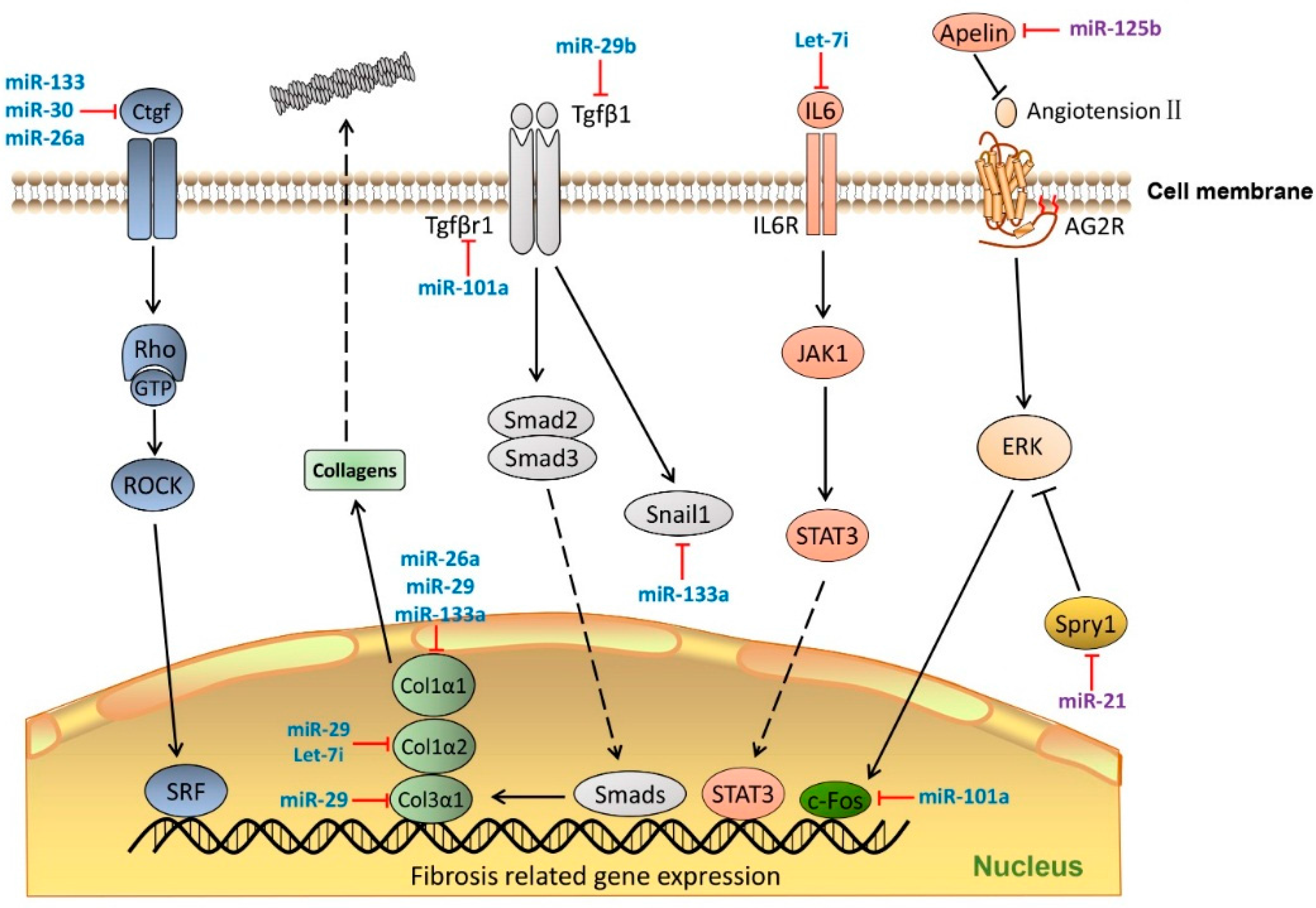 MiRNAs in cardiac fibrosis pathway. MiRNAs regulate cardiac fibrosis process by targeting the key molecules that mediate transcription of ECM genes and TGFβ signaling. MiRNAs colored in blue indicate anti-fibrosis function, miRNAs colored in purple indicate pro-fibrosis function. Dashed lines indicate translocation of molecules from cytoplasm to nucleus. Ctgf, connective tissue growth factor; Rho-GTP, Rho-GTPase-activating protein; ROCK, Rho associated coiled-coil containing protein kinase; SRF, Serum response factor; Col1a1, Collagen, type 1 α 1; COL1α2, collagen, type 1 α 2; COL3α1, collagen, type 3 α 1; Tgfβ1, transforming growth factor β 1; TgfβR1, transforming growth factor β receptor 1; Smad2/3, SMAD family member 2/3; Snail1, snail family zinc finger 1; IL6, Interleukin 6; IL6R, interleukin 6 receptor; JAK1, Janus kinase 1; STAT3, signal transducer and activator of transcription 3; c-Fos, FBJ murine osteosarcoma viral oncogene homolog; Spry1, sprouty homolog 1. Dash line arrows indicate the relocation of proteins; solid lines arrows indicate signaling cascades.
