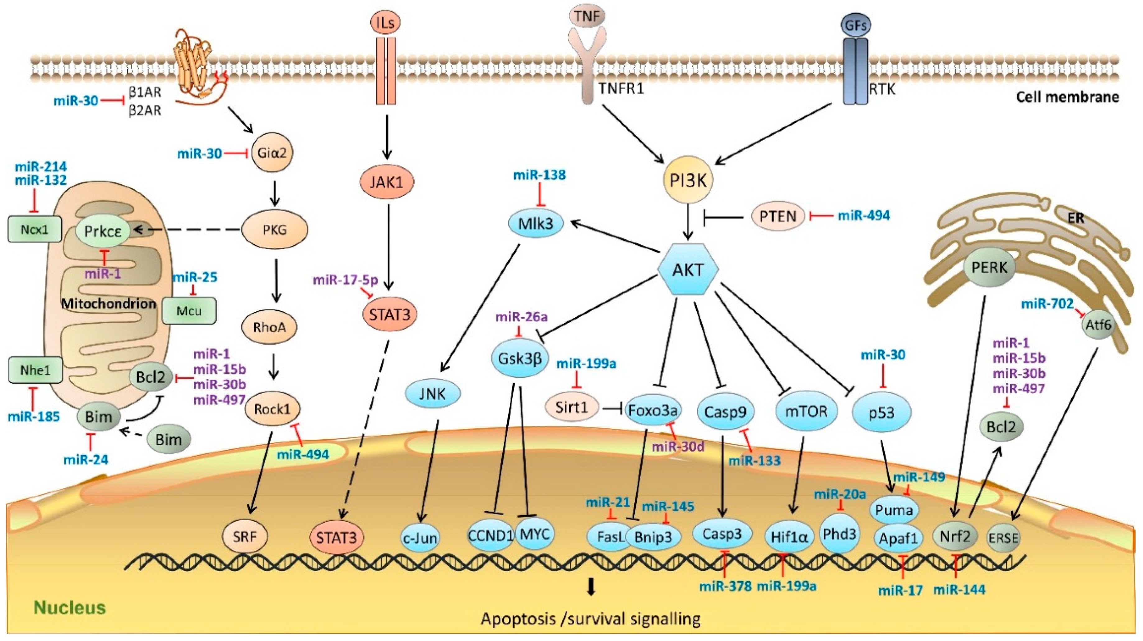 MiRNAs in cardiomyocyte apoptosis pathway. MiRNAs regulate cardiac apoptotic processes by targeting key molecules in mitochondria, endoplasmic reticulum, as well as, JAK-STAT3 and PI3K/AKT pathways. MiRNAs colored in blue indicate the anti-apoptosis functions, miRNAs colored in purple indicate pro-apoptosis functions. β1AR, adrenoceptor β 1; β2AR, adrenoceptor β 2; Giα2, G protein α i subunit; PKG, cGMP-dependent protein kinase; RhoA, Ras homolog family member A; STAT3, Signal transducer and activator of transcription 3; Rock1, Rho associated coiled-coil containing protein kinase 1; SRF, serum response factor; Ncx1, sodium/calcium exchanger 1; Nhe1, Na+/H+ exchanger 1; Prkcε, protein kinase C ε; Mcu, mitochondrial calcium uniporter; Bcl2, B-cell CLL/lymphoma 2; Bim, Bcl2 like 11; ILs, Interleukins; JAK1, Janus kinase 1; STAT3, signal transducer and activator of transcription 3; c-Fos, FBJ murine osteosarcoma viral oncogene homolog; TNF, tumor necrosis factor; TNFR1, tumor necrosis factor receptor 1; GFs, growth factors; RTK, receptor tyrosine kinases; PI3K, phosphatidylinositol 3 kinase; Pten, phosphatase and tensin homolog; AKT, Protein kinase B; Mlk3, mitogen-activated protein kinase 11; JNK, mitogen-activated protein kinase 8; c-Jun, transcription factor AP-1-like; Gsk3β, glycogen synthase kinase 3 β; CCND1, cyclin D1; MYC, myelocytomatosis oncogene; Foxo3a, Forkhead box O 3a; Sirt1, Sirtuin 1; FasL, Fas ligand; Bnip3, Bcl2/adenovirus E1B 19 kDa interacting protein 3; Casp9, caspase 9; Casp3, caspase 3; m-TOR, mechanistic target of rapamycin; Hif1α, hypoxia-inducible factor 1, α subunit; Phd3, Egl-9 family hypoxia-inducible factor 3; p53, Tumor protein p53; Puma, Bcl2 binding component 3; Apaf1, Apoptotic peptidase activating factor 1; PERK, eukaryotic translation initiation factor 2 α kinase 3; Atf6, activating transcription factor 6; Nrf2, nuclear factor, erythroid 2 like 2; ERSE, ER stress response element; ER, endoplasmic reticulum. Dash line arrows indicate the relocation of proteins; solid line arrows indicate signaling cascades.