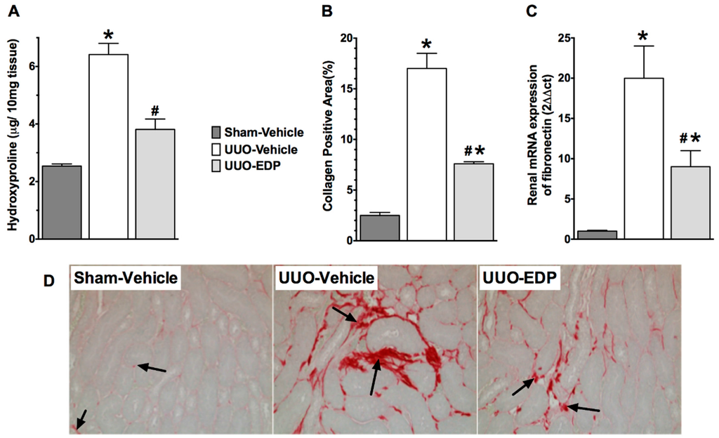 In UUO mice, there was marked renal interstitial fibrosis compared to sham control mice. Histopathological analysis of collagen positive renal fibrotic area demonstrated that UUO mice had 8-times higher collagen positive renal fibrotic area compared to sham control mice (Figure 2A,D). UUO mice treated with 19,20-EDP had reduced renal fibrosis with a 60% decrease in the collagen positive fibrotic area. (Figure 2A,D). Measuring renal tissue hydroxyproline content and fibronectin expression were also determined to evaluate renal fibrosis in UUO mice. UUO mice kidneys had elevated hydroxyproline levels (6.4 ± 0.30 μg/10 mg protein) compared to sham control mice (2.5 ± 0.05 μg/10 mg protein). 19,20-EDP treatment in UUO mice reduced the kidney hydroxyproline levels by 40% (3.8 ± 0.2 μg/10 mg protein) (Figure 2B). UUO mice also had a 20-fold higher renal mRNA fibronectin expression compared to sham control mice and 19,20-EDP reduced fibronectin expression by 50% (Figure 2C).