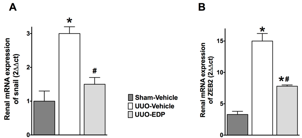 UUO mice demonstrated epithelial-to-mesenchymal transition (EMT) compared to sham control mice. UUO mice had 30%–50% lower renal E-cadherin mRNA and protein expressions compared to sham control mice. Interestingly, in UUO mice, 19,20-EDP treatment increased E-cadherin expression by 30%–60% compared to vehicle treated UUO mice both in the mRNA and protein expression levels (Figure 3). This study also demonstrated 3–4-fold higher mRNA expression of mesenchymal markers FSP-1 and desmin in UUO mice kidneys compared to sham control mice. 19,20-EDP treatment reduced renal FSP-1 and desmin mRNA expression in UUO mice and brought their expression to a level similar to that of sham control mice (Figure 4A,B). Renal expression of a prominent EMT marker α-SMA was also markedly reduced by 19,20-EDP treatment to UUO mice. In immunohistological analysis, UUO mice demonstrated 80% higher renal α-SMA immunopositive area compared to sham control mice. 19,20-EDP treatment reduced renal α-SMA expression by 60% in UUO mice (Figure 4C,D). UUO mice also had higher renal mRNA expression of EMT regulator genes Snail 1 (3-fold higher) and ZEB2 (12-fold higher) compared to sham control mice. The 19,20-EDP treatment markedly reduced the renal expressions of Snail 1 and ZEB2 in UUO mice by 50%–60% (Figure 5A,B).