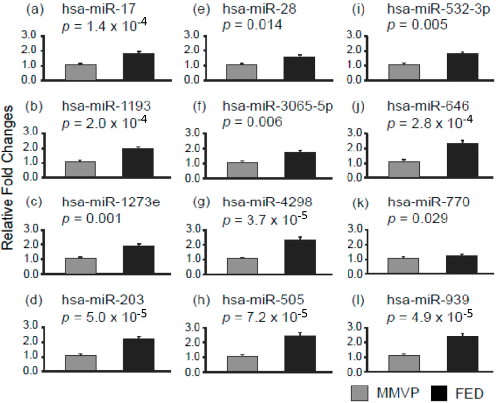 Differential microRNAs expression patterns in MMVP and FED samples. The expressions of selected microRNAs were examined by using semi-quantitative PCR. (a) hsa-miR-17; (b) hsa-miR-1193; (c) hsa-miR-1293e; (d) hsa-miR-203; (e) hsa-miR-28; (f) hsa-miR-3065-5p; (g) hsa-miR-4298; (h) hsa-miR-505; (i) hsa-miR-532-3p; (j) hsa-miR-646; (k) hsa-miR-770; and (l) hsa-miR-939. Data are presented as mean ± SEM, Student’s t-test, p values as indicated, n = 10.