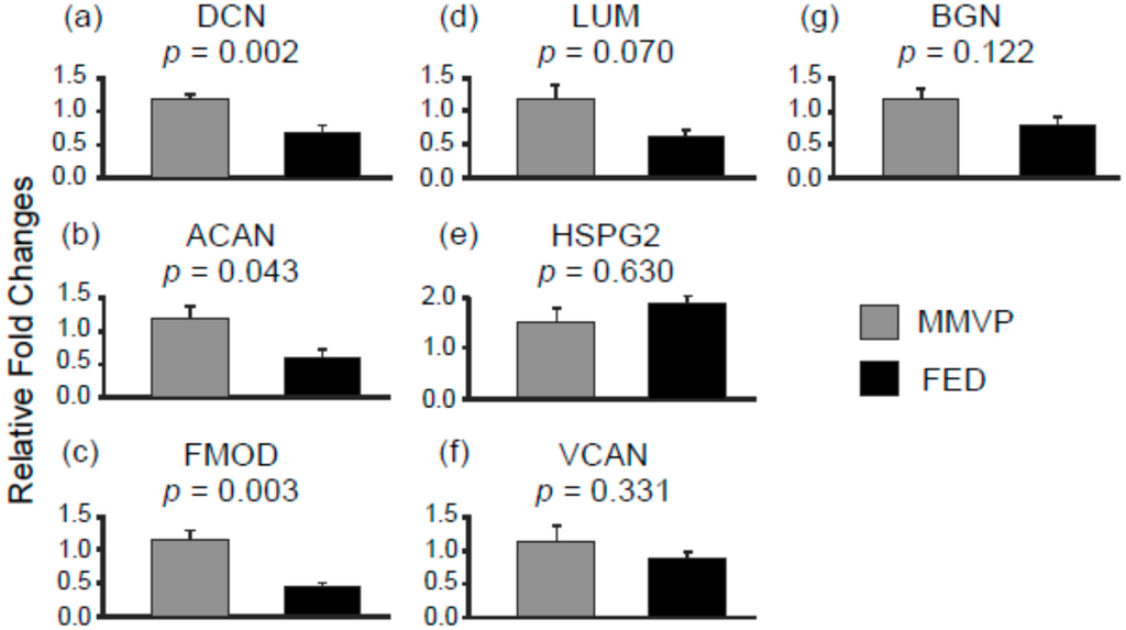 The mRNA expression of proteoglycan genes in MMVP and FED samples. (a) DCN, decorin; (b) ACAN, aggrecan; (c) FMOD, fibromodulin; (d) LUM, lumican; (e) HSPG2, heparin sulfate proteoglycan 2; (f) VCAN, versican; and (g) BGN, biglycan. Data are presented as mean ± SEM, Student’s t-test, p values as indicated, n = 10.