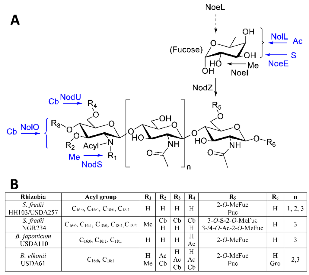 (A) Structure of nodulation factors produced by Sinorhizobium fredii HH103, USDA257, and NGR234 and Nod proteins involved in their decoration. Proteins marked in blue are only found in strain NGR234. Abbreviations of substituents are as follows: Ac, acetyl; Cb, carbamoyl; Me, methyl; S, sulfate; and (B) Comparison of Nod factors produced by different S. fredii strains, Bradyrhizobium japonicum USDA110, and Bradyrhizobium elkanii USDA61.