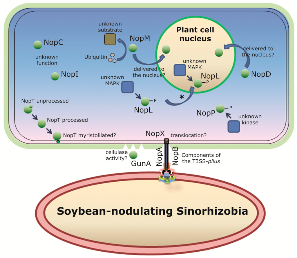 On the other hand, NopC, NopD, NopJ, NopL, NopM, NopP, and NopT can be considered putative effectors. While NopD, NopJ, NopM, and NopT are similar to effectors found in different animal and plant pathogens, NopL, NopP, and NopC are specific for rhizobia [122].