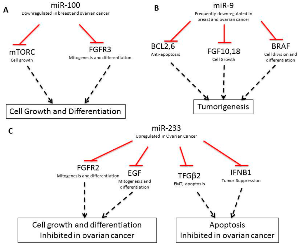 As shown in Table 2, several miRNAs are also involved in the increased invasiveness of breast and ovarian cancers and the development of higher grade tumors. For example, the downregulation of miR-9-3, is implicated in breast cancer metastasis, vascular invasion, angiogenesis, and drug resistance development [31,40]. miR-9 expression downregulates BCL2, BCL6, FGFR10, FGFR18, and BRAF, which are involved in anti-apoptosis, cell-growth, and differentiation. Downregulation of miR-9 upregulates these pathway (Figure 2B, [43]).
