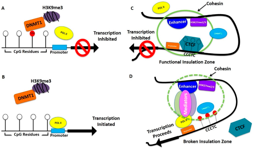 Model of DNA methylation and histone methylation regulating gene expression for breast and ovarian cancer initiation. (A,B) Hypermethylation is indicated by red balls (CpG residue). White balls represent unmethylated CpG residues. DNMT1 represents DNA methyl transferase 1, POLII represents RNA polymares II; (B) In the absence of hypermethylation, POLII is able to bind to the promoter region and initiate transcription; (C,D) White balls represent unmethylated, and red balls represent hypermethylated CpG residues. CCCTC is CTCF binding motif. The green circle represents effective insulation zone. Break of insulated zone is shown by dotted green circle.