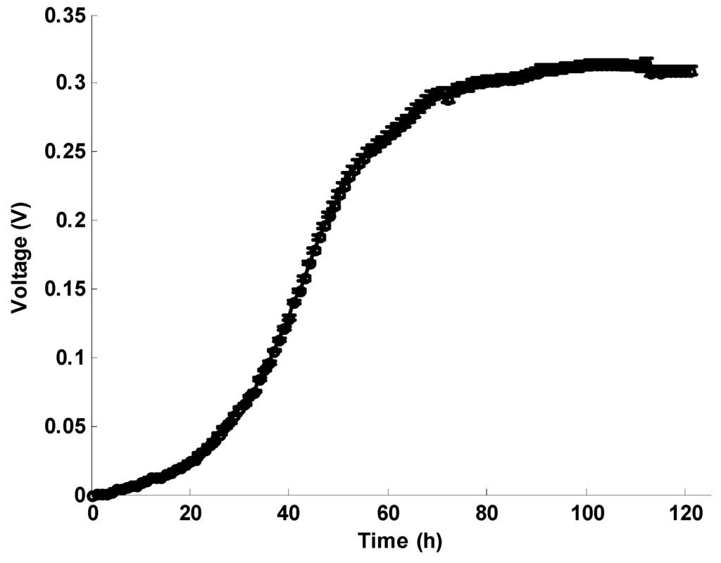 The voltage between electrodes in the inoculation experiment is shown in Figure 1. After injecting the medium, the voltage between the electrodes starts increasing. About 30 h later, a rapid voltage (current) increase is found. This phenomenon is also observed in our AMFC experiments, and it has also been verified in other papers [,,]. About 80 h later, the voltage stabilizes at a value of about 0.3 V.