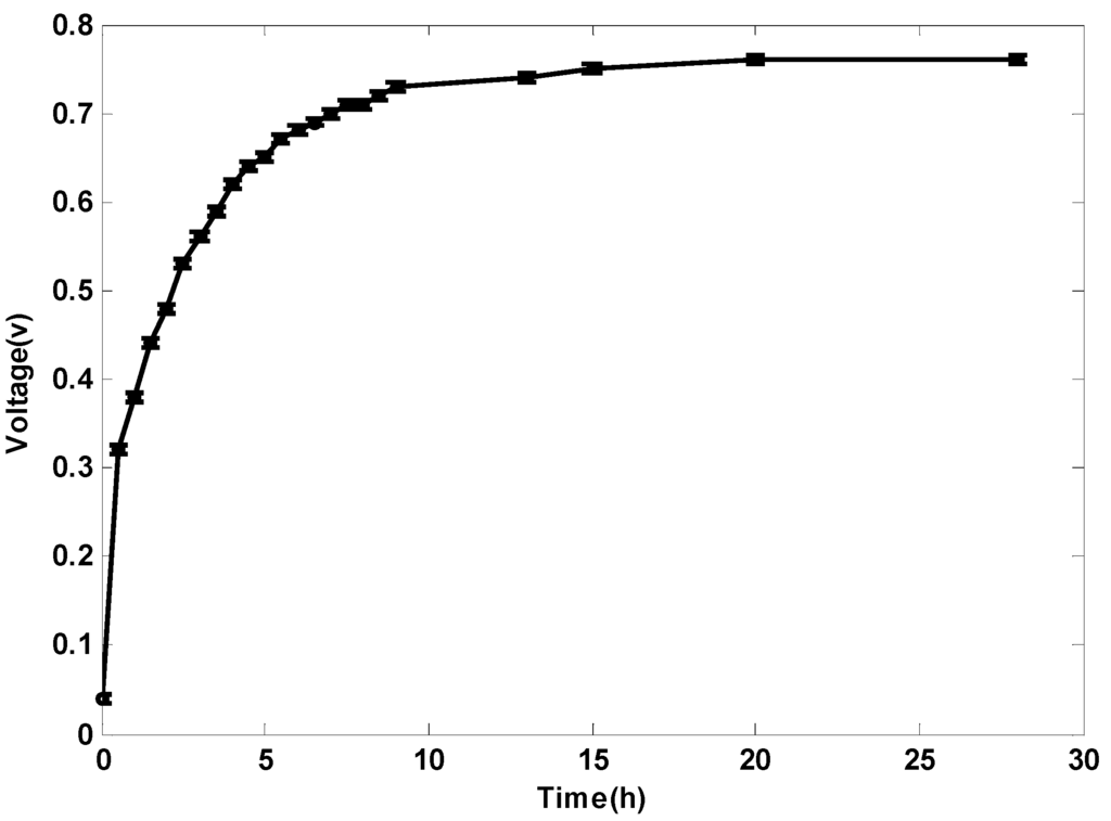 After the inoculation experiment, the resistor between electrodes was disconnected, and the OCV was tested; refer to Figure 2. It took about 25 h for the voltage between electrodes to become stable. The experiment can be implemented any time after inoculation. The OCV of the proposed TMFC is about 0.75 V, which is a reasonable value for MFCs [].