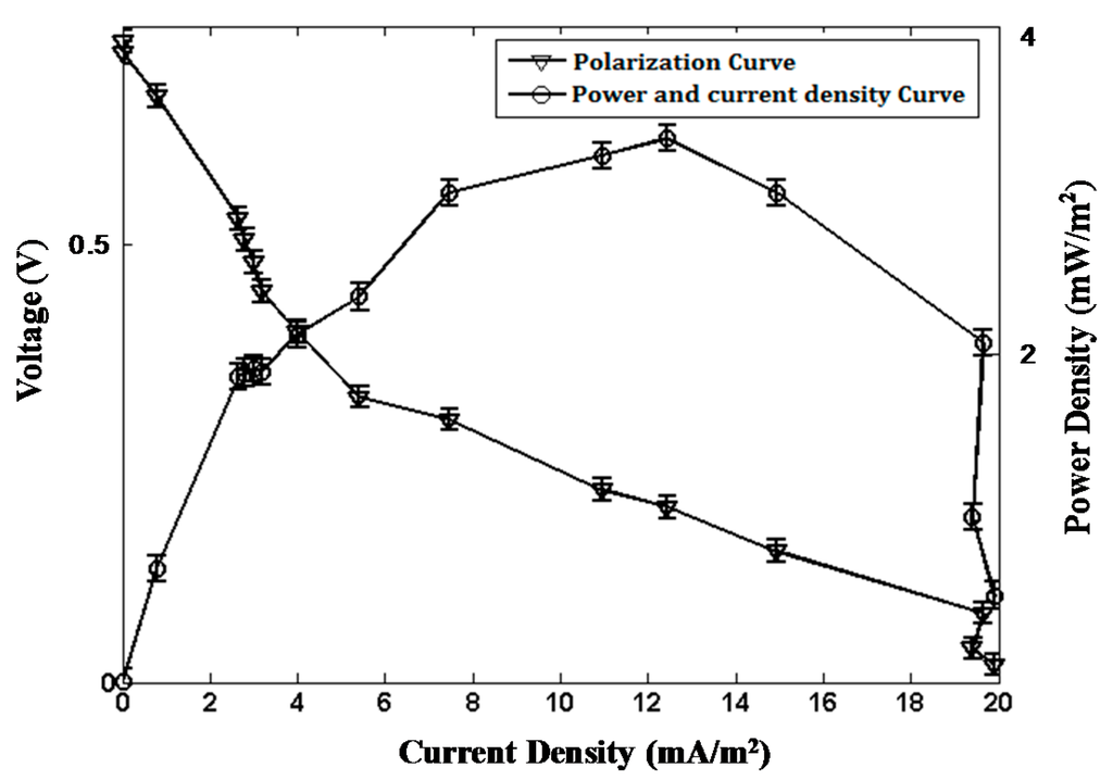 Polarization and power curves are the representative characteristics for the power generation performance of MFCs. These curves of the proposed TMFC (Figure 3) were obtained according to the procedure detailed in Materials and Methods.