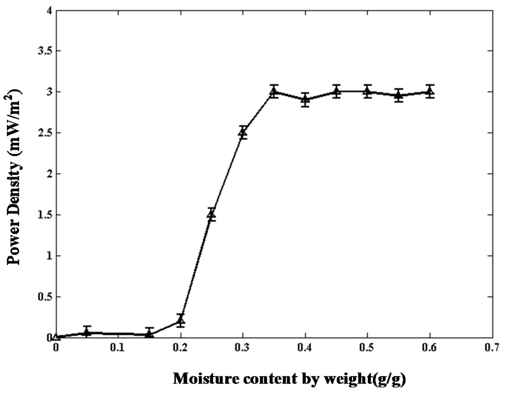 The relationship between the soil moisture content by weight and the output power density of the TMFC is recorded; refer to Figure 4. The output power density nears zero when the soil moisture content is below approximately 0.2 g/g. The power density increases with the increase of soil moisture content, while the soil water content is between 0.2 and 0.4 g/g. The output power density achieves the maximum when the soil moisture content approaches 0.4 g/g. The power density remains unchanged if the soil moisture content exceeds 0.4 g/g.