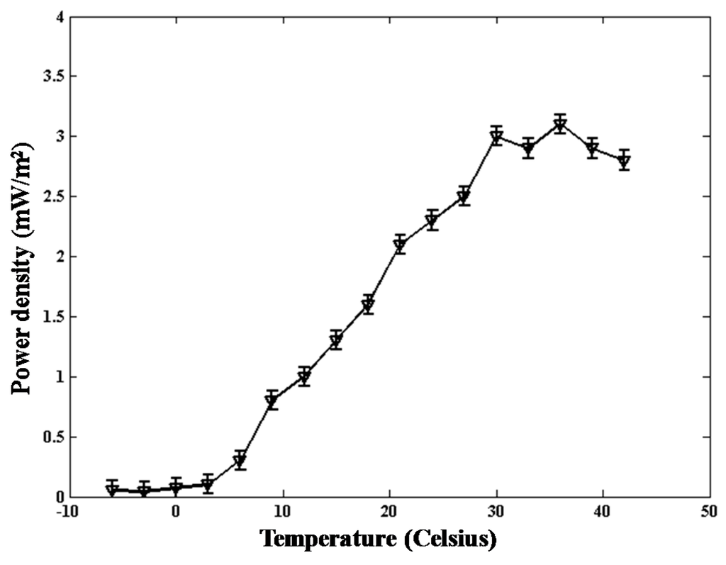 We recorded the relationship between temperature and the power density of the proposed TMFC. The result is shown in Figure 5. As shown in the figure, the output power density increases with the increase of temperature, while the temperature is below 36 °C. The output density begins to drop when the temperature is greater than 36 °C.