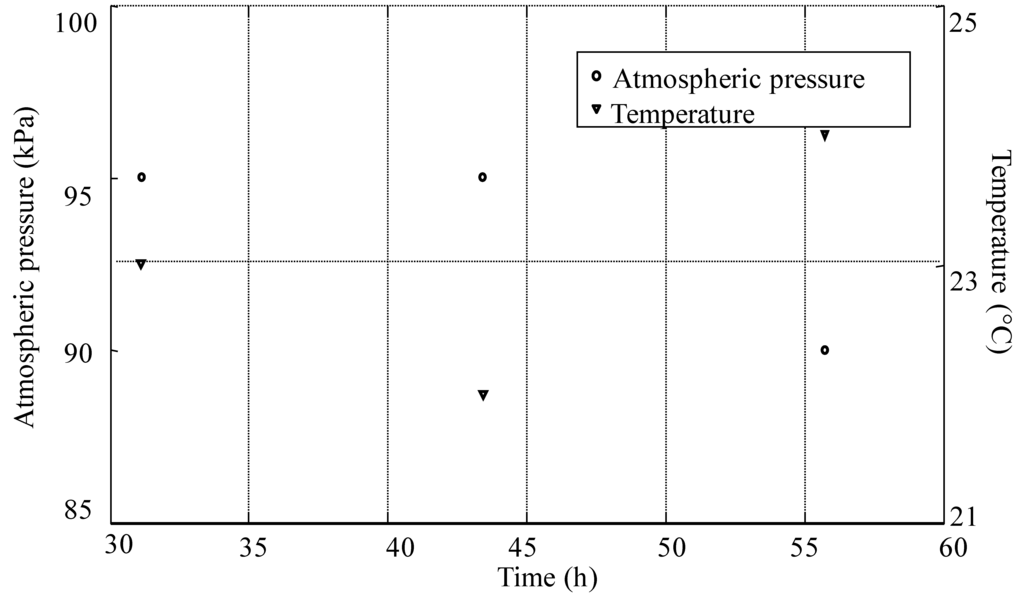 The access point receives three packets each period, which includes the temperature and atmospheric pressure information. The stable duty cycle is about 12 h, which is in accordance with the duty cycle of the PMS board. Because the experiments were implemented in the laboratory environment, the sensor data do not vary too much over time.