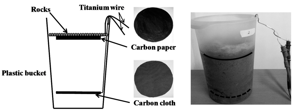 A TMFC experimental device has been designed and constructed; see Figure 9. The TMFC reactor is a plastic bucket. The diameter is 150 mm at the bottom, and 190 mm at the top. It has a height of 260 mm. The anode material is carbon cloth (HCP330, Hesen, Shanghai, China), which is a disk of 160 mm diameter, and it is placed at a height of 45 mm from the bottom of the bucket. The cathode material is carbon paper (HCP030, Hesen, Shanghai, China), which is a disk that is 160 mm in diameter. The anode is covered with Pt-catalyst (XC-72, Fuel Cell Store, Boulder, CO, USA). The electrodes have a distance of 110 mm. On the top of the cathode, a layer of rocks is placed. This provides the deformation of the carbon paper. The electronic loads were connected to the anode and cathode by two titanium wires. We collected soil from the forest (Qinling Mountains, Xi’an, China) off the beaten path, which tends to be rich of microbes and nutriments.