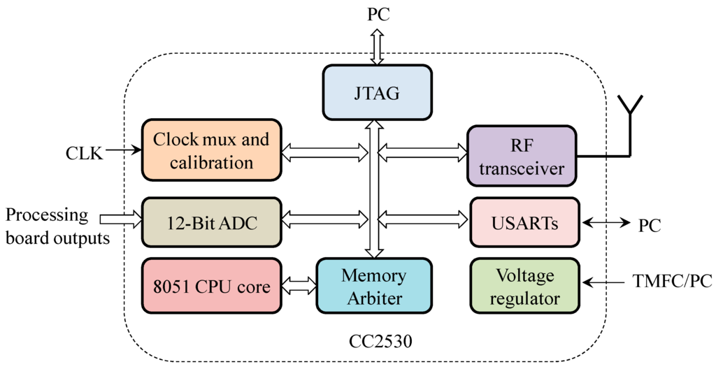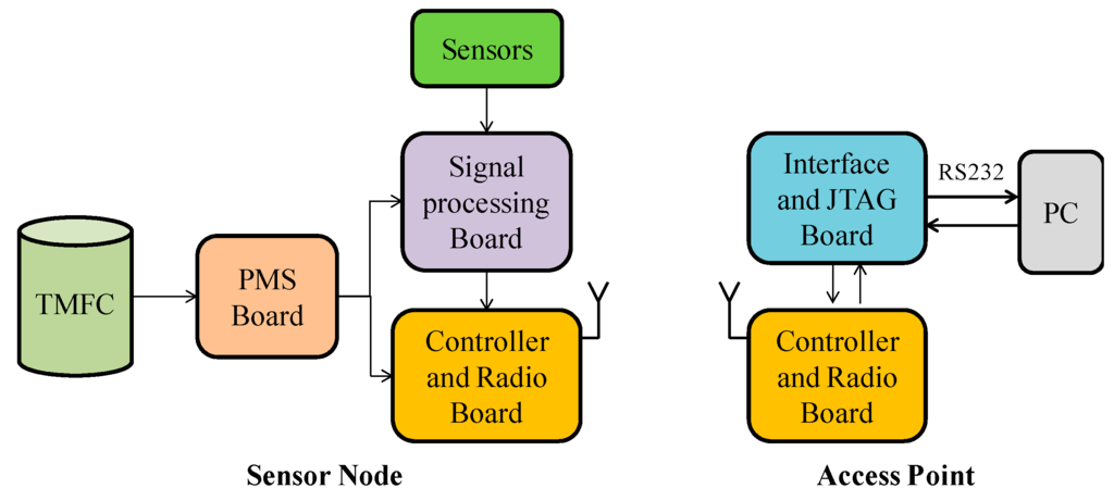 The WSN platform comprises two parts: a sensor node and an access point. The sensor node consists of two sensors, a signal processing board, a controller and radio board, a TMFC reactor, and a PMS board. The access point includes a controller and a radio board (the same as used in the sensor node), a PC, an interface, and a Joint Test Action Group (JTAG) board. The overall block diagram of the WSN platform is shown in Figure 10.