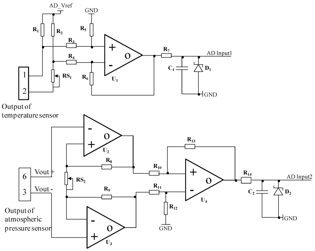Two sensors are selected for environmental monitoring. One is for temperature monitoring (WZP-010, Heraeus, Hanau, Germany), and the other is for atmospheric pressure monitoring (MPS30H0500AT, MEMStek, Wuxi, China). Because the output signals coming from the sensors are very weak and are easily affected by noise, a sensor signal processing board is designed to amplify the output signals of sensors. After amplifications, the signals are acquired by the controller. The main component of the signal processing board is a precision amplifier (OPA2340, TI, Dallas, TX, USA). It can operate at a voltage as low as 2.5 V. The schematic diagram of the signal processing board is shown in Figure 11.
