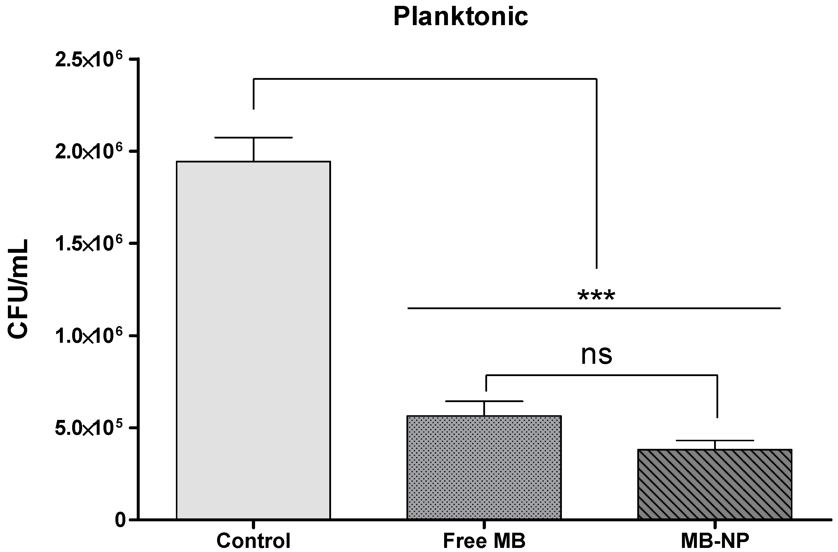 Recovered CFU/mL after antimicrobial photodynamic therapy (aPDT) treatment of planktonic bacteria with free methylene blue (MB) (25 µg/mL) and MB-NP (25 µg/mL equivalent to MB) and visible light at 660 nm with an energy fluence of 20 J/cm2. Each bar is the mean values of the means from 10 samples (data from each sample were representative of four independent suspensions). Error bars denote the standard deviation of the mean. The asterisks represent the statistical difference between the groups and the control (one-way ANOVA with Tukey’s post hoc). *** p < 0.001; ns: not significant; MB: methylene blue; MB-NP: MB-loaded PLGA nanoparticles; CFU: colony forming units.