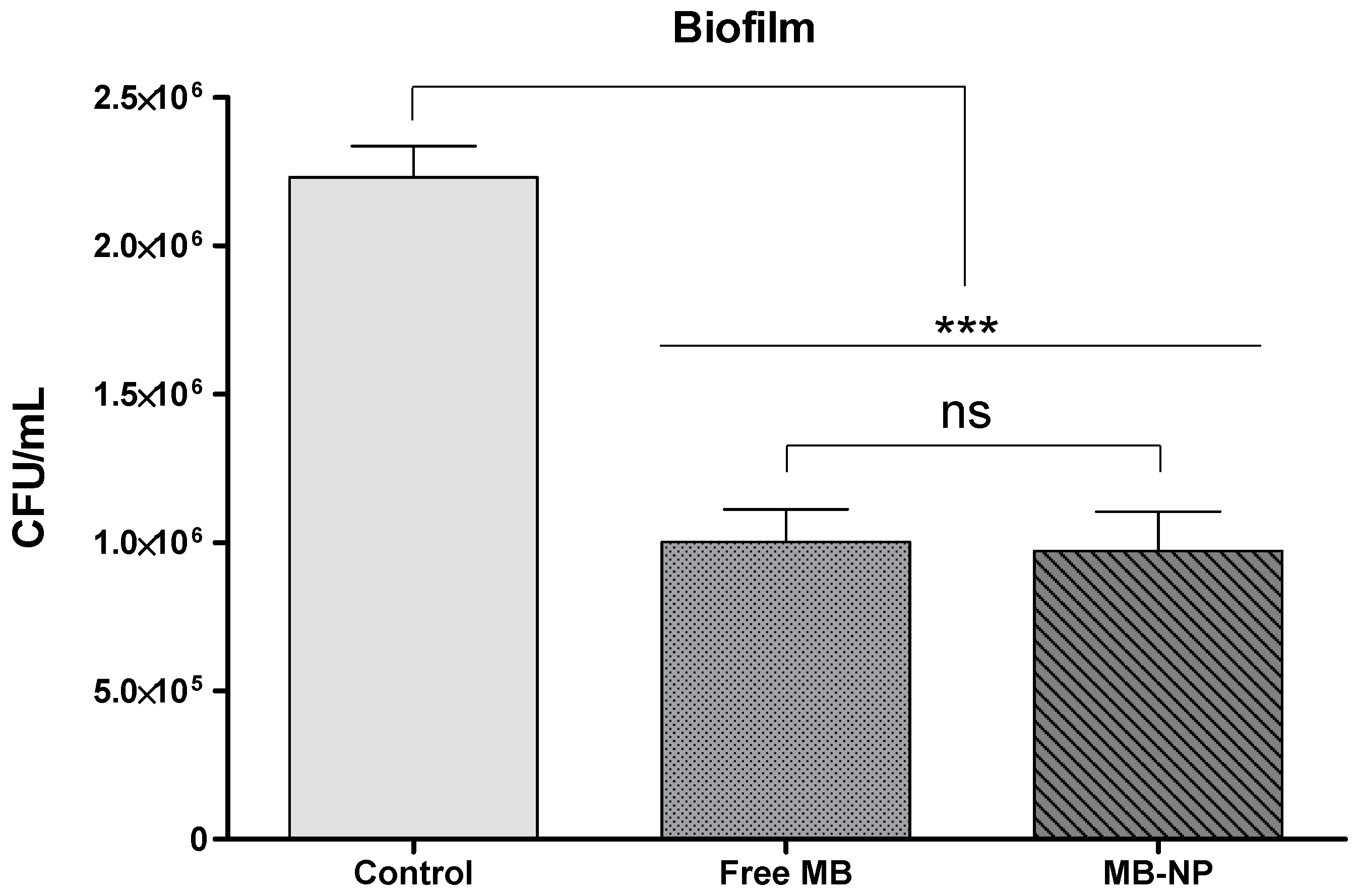 In both planktonic and biofilm experiments, groups treated only with free MB, MB-NP or light did not show significant differences compared with the control group (no drug/no light), indicating an absence of toxicity for light, MB, or MB-NP alone (data not shown).