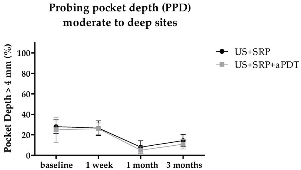 After treatments, both groups exhibited a trend of a reduction of moderate and deep sites (Figure 3). Results were more evident at one month, with a tendency to return to baseline levels by three months after treatments in both groups. Ultrasonic scaling (US) + SRP associated with aPDT had a slightly better outcome than US + SRP alone (p = 0.0298).