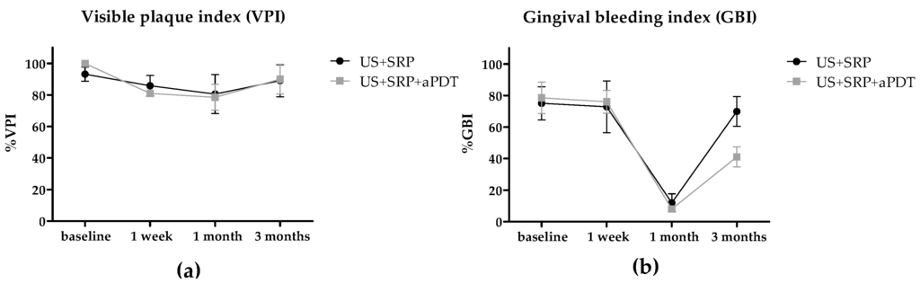 Visible plaque index (VPI) was similar for both groups at all time points, with no statistically significant difference observed (Figure 4a; p = 0.9299). After three months, there was a tendency of returning to baseline levels, as noticed for probing pocket depth (PPD). Gingival bleeding index (GBI) percentages decreased drastically and similarly for both groups by one month after treatment (Figure 4b; p = 0.4571). Nonetheless, US + SRP + aPDT had a better performance (28.82%) in preventing GBI compared to US + SRP at three months.