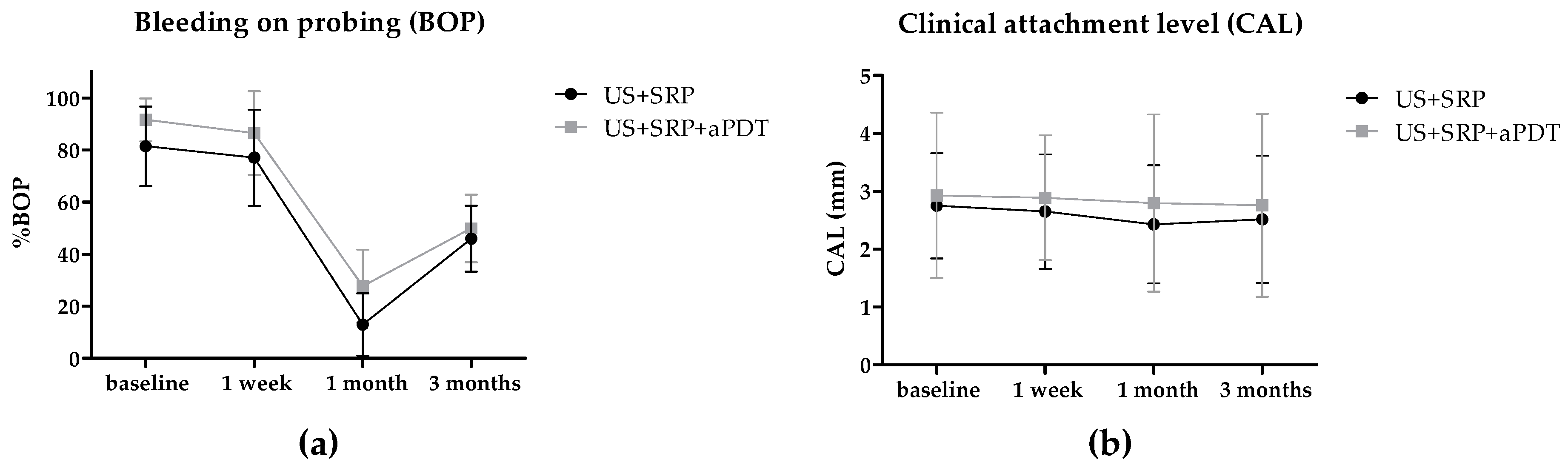 The percentage of sites with bleeding on probing (BOP) decreased significantly in both groups one month after treatments, with US + SRP + aPDT group being statistically more effective in reducing BOP than US + SRP (Figure 5a; p = 0.0229). Clinical attachment level (CAL) level was sustained in both groups through all time points with no statistical differences between them (Figure 5b; p = 0.7826).