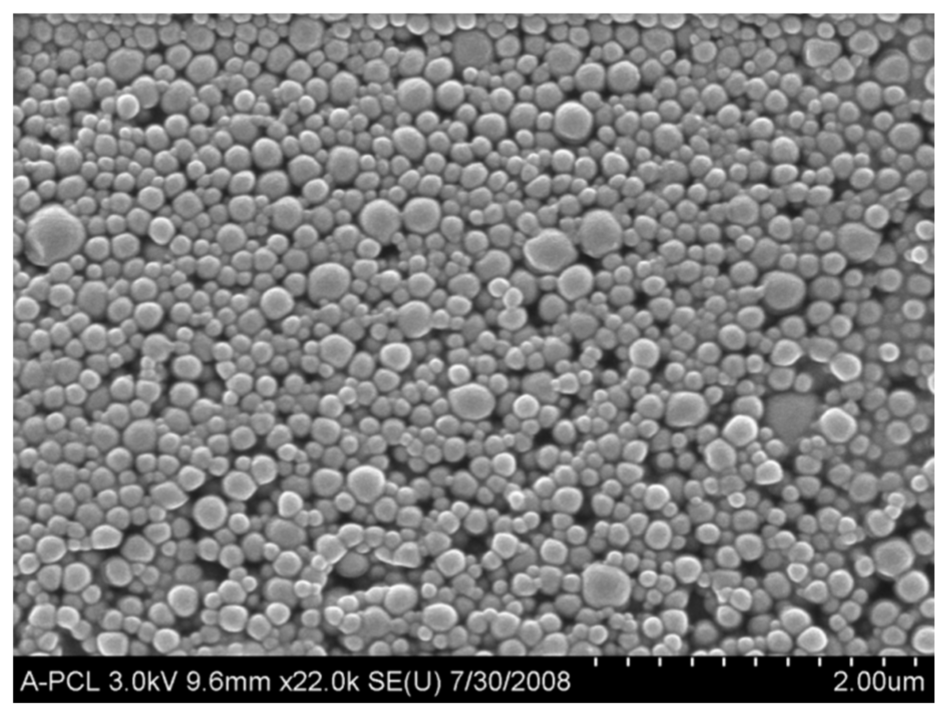 MB loaded into PLGA nanoparticles (10% w/w) were prepared in the Department of Pharmaceutical Sciences at Northeastern University as previously described [33]. Briefly, a PLGA (76 mg) and Pluronic® F-108 (14 mg) solution was prepared in 5 mL of acetone. MB as oleate salt (Sigma Chemicals Co.) was dissolved at 10% (w/w) concentration in the PLGA acetone solution for the preparation of the MB-loaded nanoparticles. To insure that the formed nanoparticles have a stable hydrophilic surface, which resists aggregation, pluronic triblock copolymers were added to the polymer solution in acetone at 20% (w/w). The acetone solution was added into an aqueous (50 mL) solution under vigorous stirring and left to stir overnight. The following day, nanoparticles were centrifuged at 10,000 rpm for 20 min, washed twice with deionized distilled water and lyophilized. Data regarding nanoparticle characterization were previously published [33]. Figure 6 shows a scanning electron micrograph of blank PLGA nanoparticles.