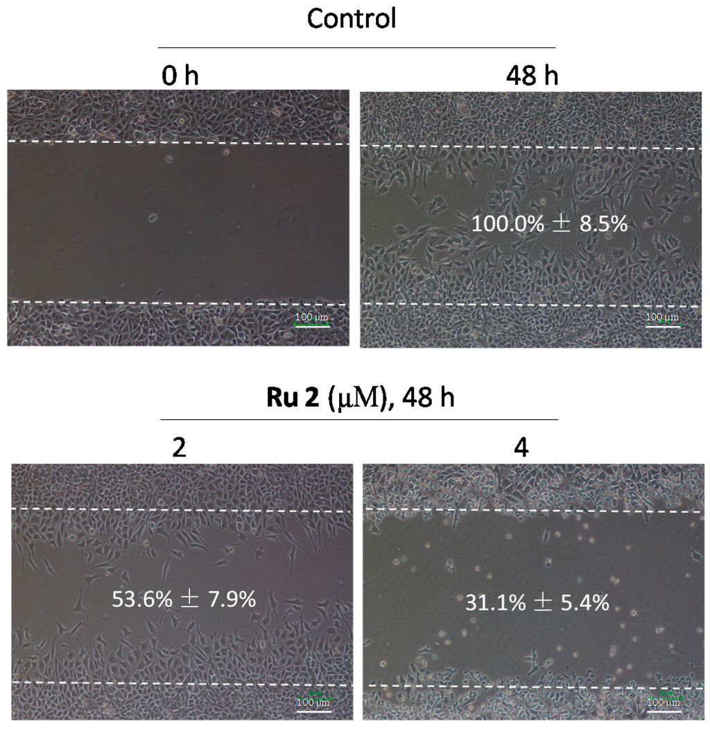 Effects of Ru2 on HepG2 cell migration. Cells were exposed to different Ru2 concentrations for 24 h and photographed using a phase-contrast microscope (200×, Nikon TS100, Nikon, Tokyo, Japan). Values in the images indicate the migration ability of the cells.