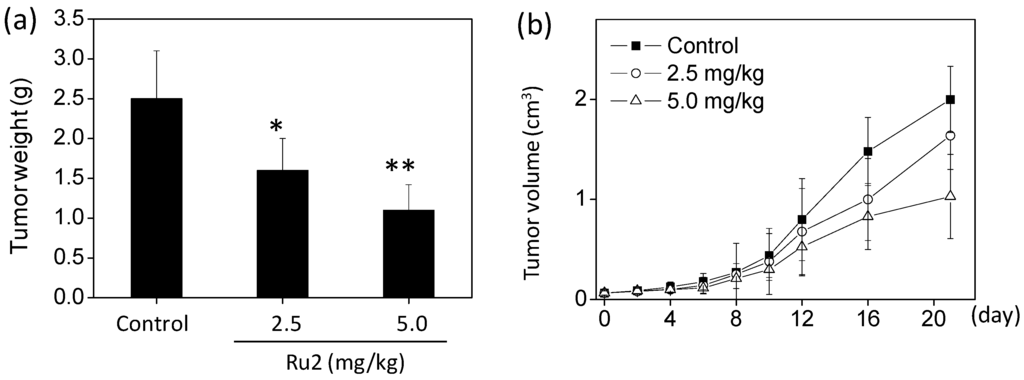 Furthermore, the in vivo anticancer activity of Ru2 against HCC was investigated in HepG2 xenografts using a nude mouse model. Following i.p. (2.5 and 5.0 mg/kg body weight on alternating days) administration for 20 days, the tumor weight significantly decreased from 2.5 to 1.6 and 1.1 g, respectively. The tumor volume dramatically decreased to 65% and 42%, respectively, of the control group (Figure 9). Moreover, the mice that received Ru2 treatment maintained normal body weight throughout the treatment process, and the mortality for the mice in different treatment groups was found at zero. These findings support the potent in vivo anticancer efficacy of Ru2 against HCC. Additional pre-clinical studies should be conducted to promote the development of this type of Ru-based anticancer metal medicine.