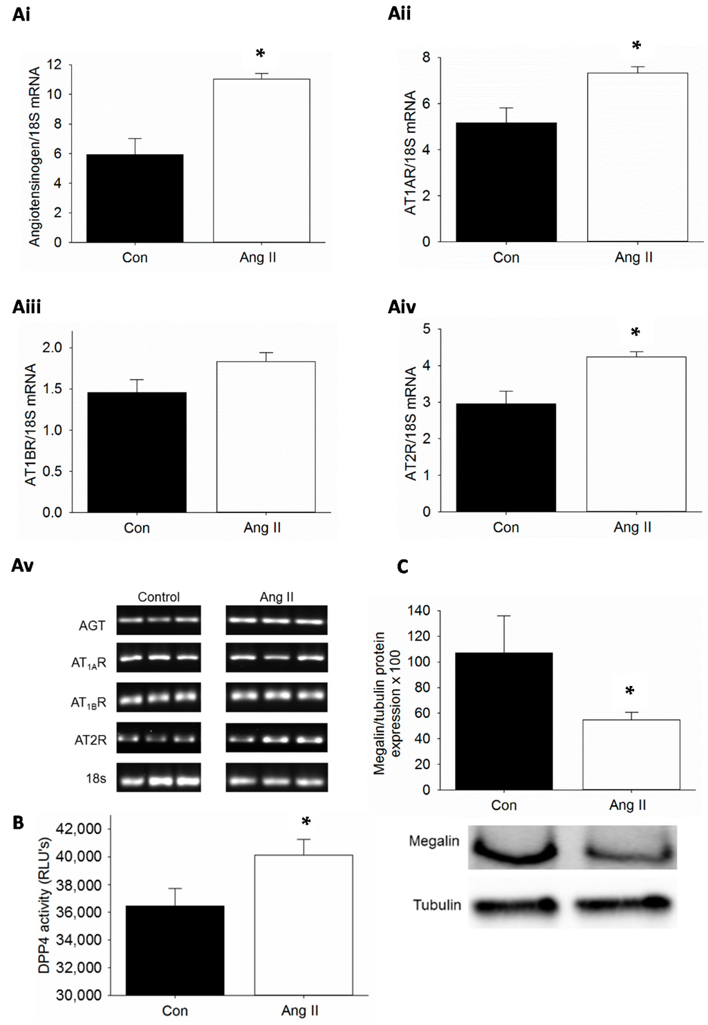 Ang II infusion activates the renin-angiotensin system (RAS) and dipeptidyl peptidase 4 (DPP4) and suppresses megalin protein levels in mice: (A) Quantification of differential mRNA expression of RAS in the kidney (Ai–Aiv) and depiction of actual bands that were used for quantification (Av); (B) DPP4 activity in the kidney expressed as relative light units (RLUs); and (C) megalin protein expression by immunoblot of kidney lysates. n = 3–4; * p < 0.05; AGT: Angiotensinogen; AT1AR: Angiotensin type 1A receptor; AT1BR: Angiotensin type 1B receptor; AT2R: Angiotensin type 2 receptor; 18s: 18s ribosomal RNA; Con: Saline-infused mice; Ang II: Ang II-infused mice (200 ng/kg/min).