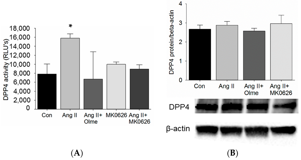 DPP4 enzymatic activity and protein levels in T35OK-AT1R proximal tubule cells after acute stimulation with Ang II: (A) DPP4 activity after stimulation (30 min) with Ang II (10−8 M) and blockade (60 min prior to Ang II) with olmesartan (10−6 M) or MK0626 (5 × 10−6 M); and (B) DPP4 protein levels after stimulation (30 min) with Ang II and blockade with olmesartan and MK0626. n = 3–5; * p < 0.05; Olme: Olmesartan; MK0626: Rodent DPP4 inhibitor (Merck & Co., Inc.).