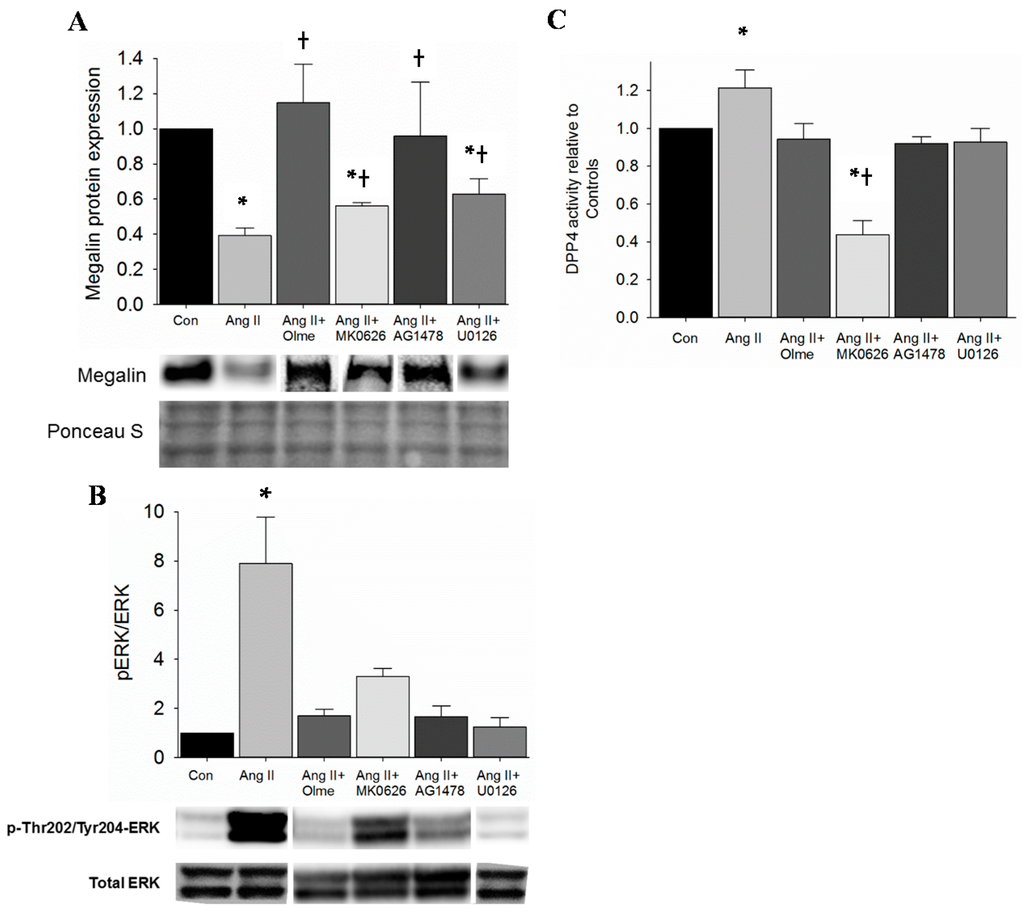 Ang II regulates megalin protein expression via DPP4 activation. (A) Megalin protein expression by immunoblot in T35OK-AT1R proximal tubule cells. Proximal tubule cells were stimulated with Ang II (10−8 M) for 24 h and pre-treated 1 h with olmesartan (10−6 M), AG1478 (10−5 M), U0126 (10−5 M) and MK0626 (5 × 10−5 M); (B) ERK1/2 activation was assessed by pThr202Tyr204-ERK1/2 increase. Proximal tubule cells were stimulated with Ang II (10−8 M) for 30 min and the ratio of pThr202Tyr204-ERK1/2 to total ERK1/2 ratio was calculated. Proximal tubule cells were pre-treated for 1 h with olmesartan (10−6 M), AG1478 (10−5 M), U0126 (10−5 M) and MK0626 (5 × 10−5 M); (C) DPP4 activity in conditions of chronic Ang II stimulation. T35OK-AT1R proximal tubule cells were stimulated for 24 h with Ang II (10−8 M) and olmesartan (10−6 M), AG1478 (10−5 M), U0126 (10−5 M) and MK0626 (5 × 10−5 M) were tested for blockade of Ang II-mediated increase in DPP4 activity. n = 3–6; * p < 0.05 when compared to control; † p < 0.05 when compared to Ang II.