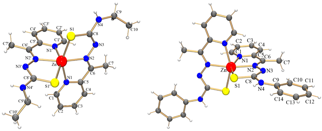 Molecular structure determined for [Zn(atc-Et)2] (1) (left) and [Zn(atc-Ph)2] (2) (right) with atom labels.