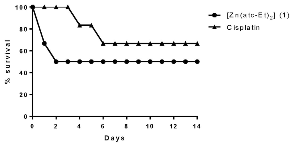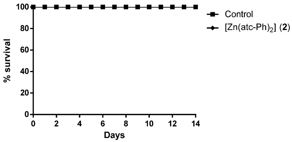 In conclusion, the results indicate that the ZnII complexes [Zn(atc-Et)2] and [Zn(atc-Ph)2] might be a promising source of new metal-based antitumor agents. Based on the investigated toxicity parameters, the complexes have been demonstrated to be safe to BALB/c mice when orally administered at the doses tested. In addition, we determined the times of Cmax of the ZnII complexes after administration via oral gavage: one hour for complex 1 and two hours for complex 2.
